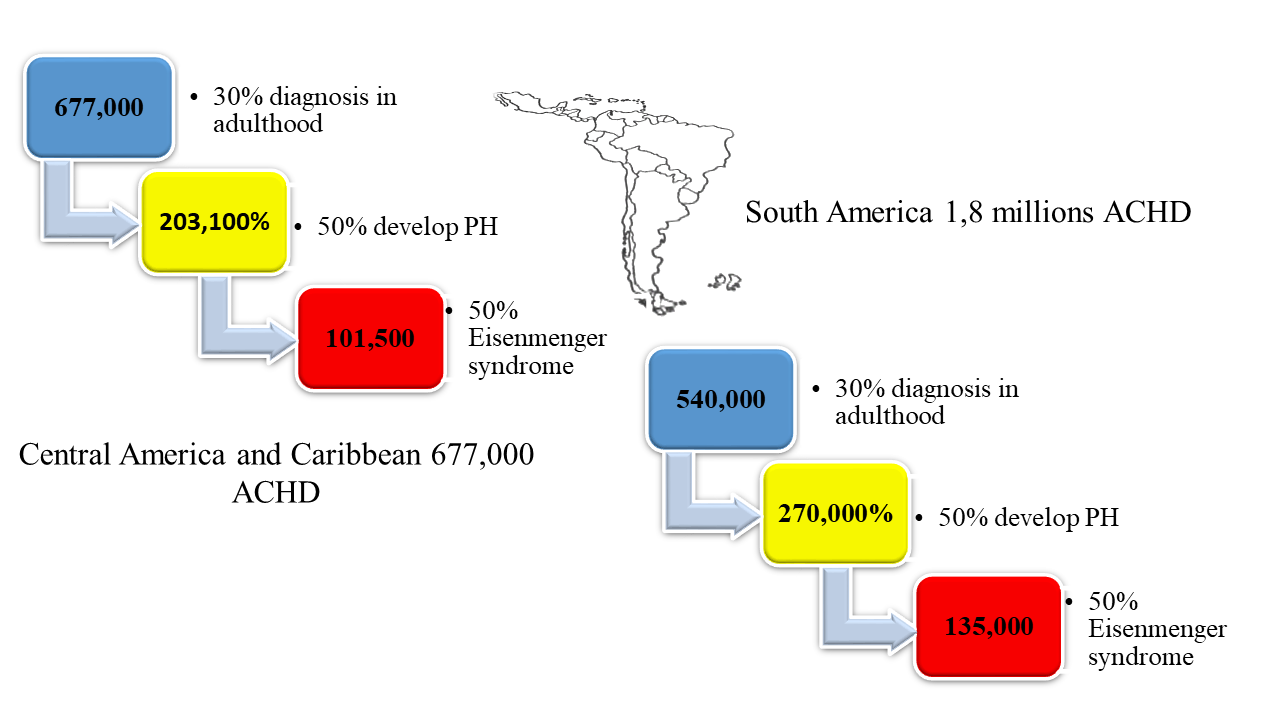 Based on this information, it is estimated that there may be more than 200,000 ACHDs and patients with ES (135,000 and 101,500 in South America, Central America and the Caribbean, respectively) (Figure 1).