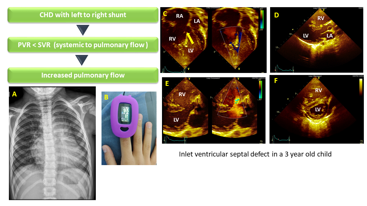 A) Chest X-ray shows cardiomegaly, increase pulmonary flow; B) Oximetry at room air 95%; C-D (echocardiographic evaluation :) C) apical 4-chamber view shows dilation of the cardiac cavities (yellow arrow shows VSD); D) long axis view (*) shows the VSD; E) long axis view color doppler, flow direction from left to right (arteriovenous direction), indicating that the PVR is less than the SVR, therefore PH, but not PAH; F) short axis view, RV dilation and D shape LV.