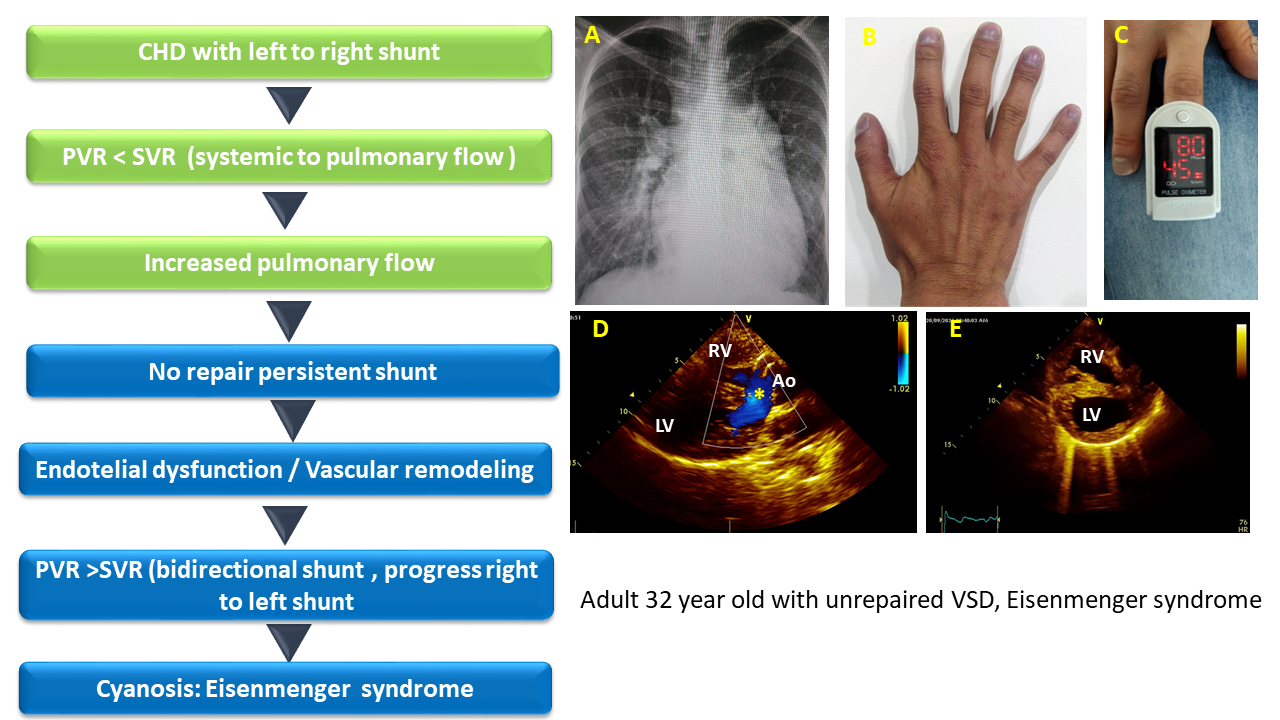 Elevated PVR translates into elevated right heart pressures, above the systemic vascular pressure. The heart defect flow changes to a two-way flow and then inverts to a right-to-left (venous-arterial) flow and causes hypoxemia and central cyanosis, as seen in ES (Figure 2 and Figure 3).