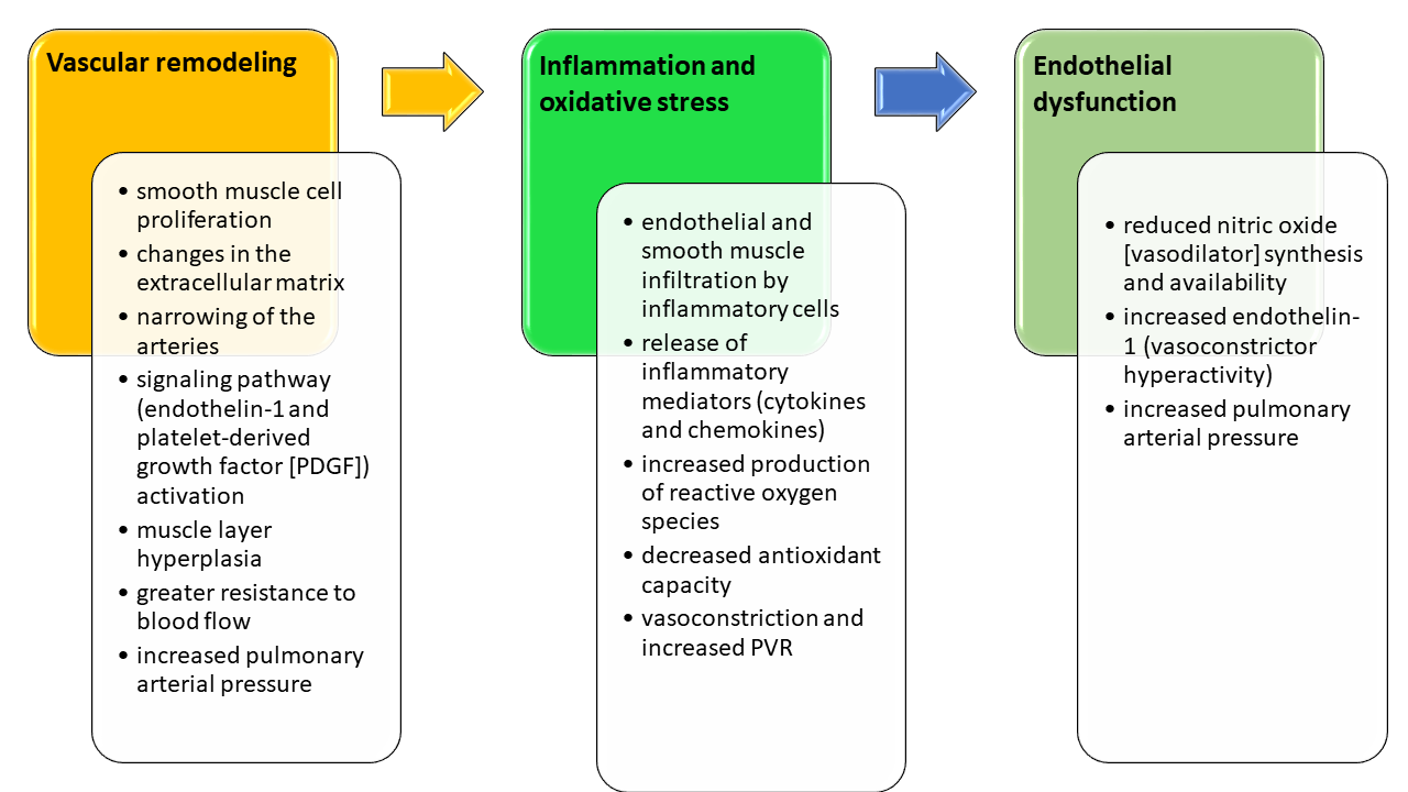 Heart defects with a left-to-right (arteriovenous) shunt cause pressure and/or volume overload in the pulmonary circulation and pulmonary vascular bed remodeling due to constant vascular stress and arterial injury. These vascular changes lead to extracellular matrix degradation and growth factor release, inflammation, oxidative stress, and endothelial dysfunction [18].