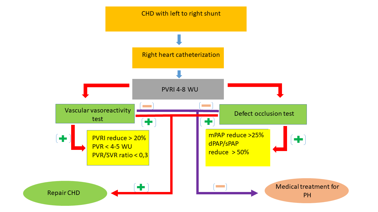 As previously mentioned, RHC is the essential test fordecision-making regarding CHD repair. With better understanding of the pathophysiology of PAH and CHDs, it is well understood that the PVR values indexed against body surface area in m 2 (PVRI) and the PVR/SVR ratio are the hemodynamic data that allow the decision to be made (Table 2).