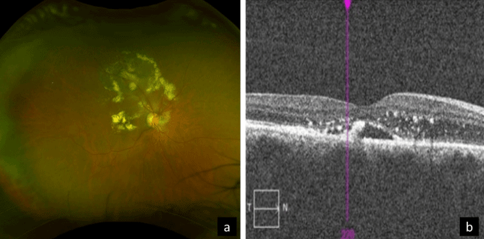 Color fundus photography (a) reveals the macroaneurysm on the superotemporal vascular arcade of the retinal artery with hard exudates in a circinate pattern surrounding the macroaneurysm and dense accumulation in the macula. Optical coherence tomography (OCT) (b) shows an accumulation of heavy hard exudates in the retina with an indistinct external limiting membrane and ellipsoid zone. Subretinal fluid and macular edema with intraretinal thickening are present from leakage of the macroaneurysm.