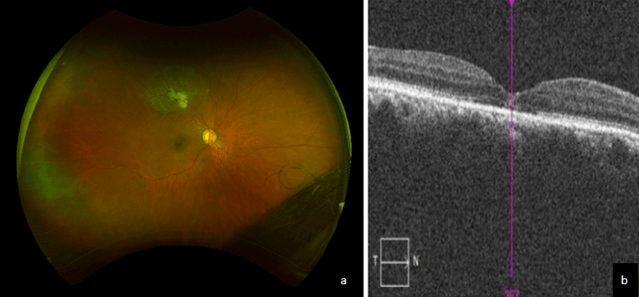 25 months after the second laser treatment, a color fundus photo (a) reveals scarring around the retinal macroaneurysm with resolution of previously photographed hard exudates. Optical coherence tomography (b) displays a resolution of the macular edema with improved architecture in the layers of the retina. The external limiting membrane has been restored, and the ellipsoid zone is undergoing restoration. Heavy hard exudates in the fovea have completely regressed.