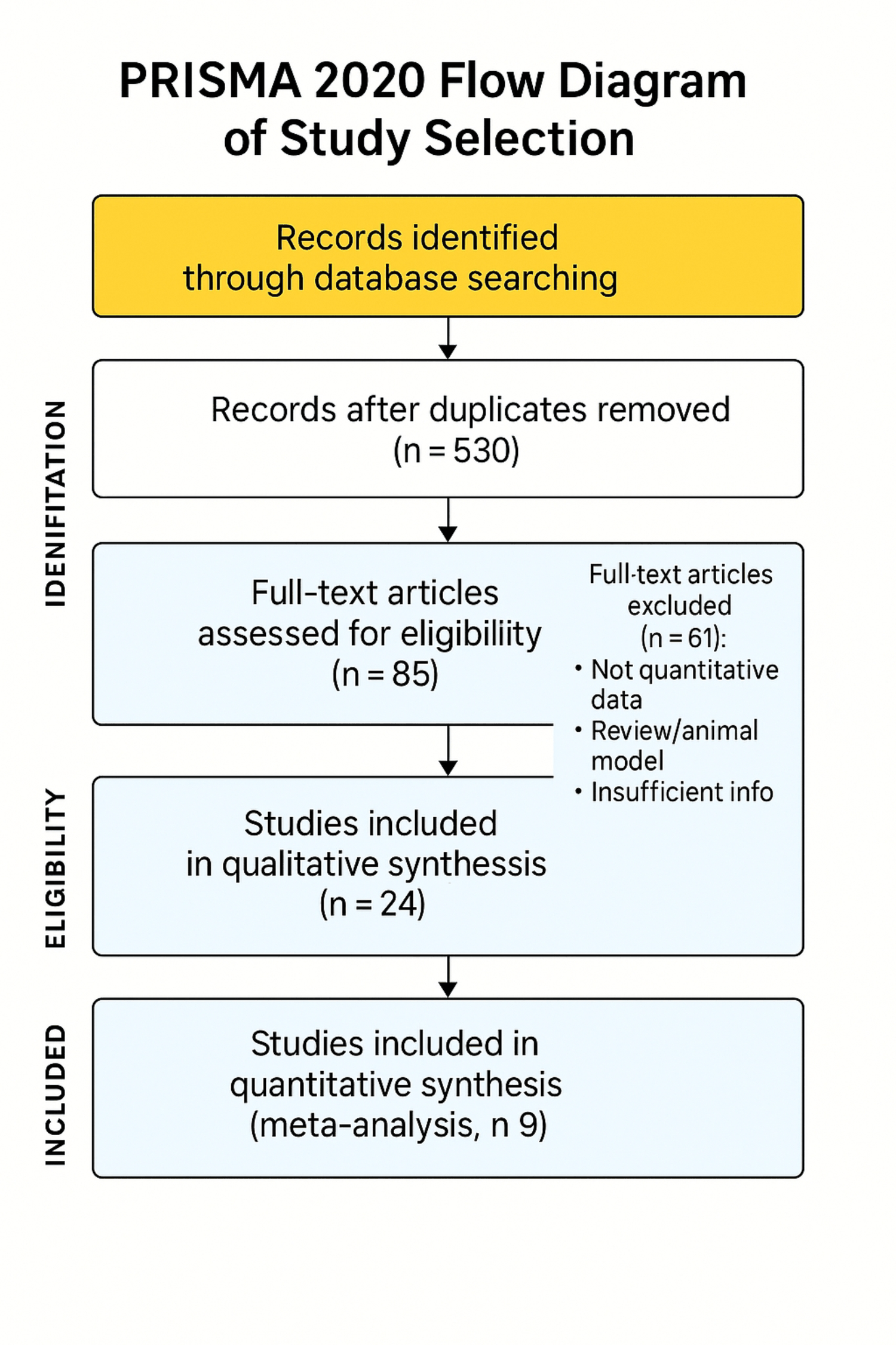 Figure 1: PRISMA 2020 flow diagram of study selection. Flow of records through identification, screening, eligibility, and inclusion. Boxes report counts at each stage: records identified by database searching; records remaining after duplicate removal (n = 530); full-text articles assessed for eligibility (n = 85), with reasons for exclusion (e.g., not quantitative data, review/animal model, insufficient information; n = 61); studies included in qualitative synthesis (n = 24); and studies included in quantitative synthesis (meta-analysis; n = 9). View Figure 1