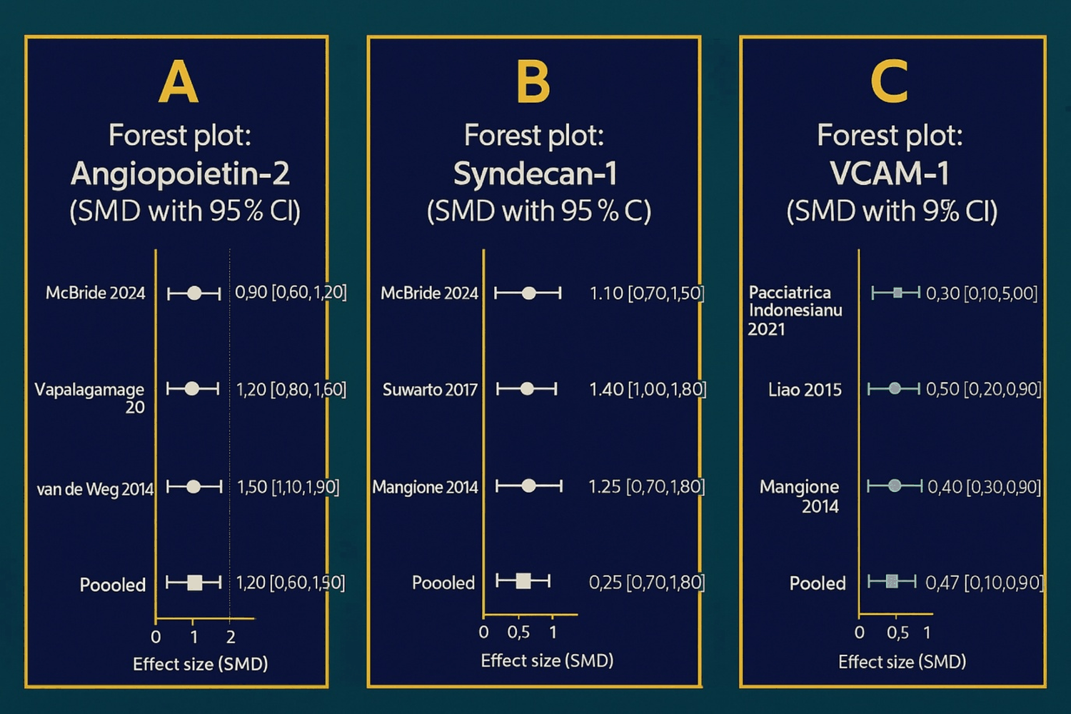 Across five studies, ANGP2 was consistently higher in DHF/DSS than in DF or healthy controls. The pooled SMD indicated significant elevation with high heterogeneity (I 2 > 50%), consistent with differences in age groups, sampling windows, and assay methods [16,17]. These findings are summarized in the ANGP2 forest plot (Figure 2A). Four studies showed a progressive rise in SDC1 with increasing severity; severe dengue had markedly higher SDC1 than DF/controls, with moderate heterogeneity (I 2 ≈ 30-40%) [20]. The pooled analysis is shown in the SDC1 forest plot (Figure 2B). Three cohorts reported elevated VCAM1 in severe disease [18,21,19]; the pooled SMD was 0.45 (95% CI, 0.14–0.75) with I 2 = 0%, indicating highly consistent effects across settings. These consistent effects are presented in the VCAM1 forest plot (Figure 2C). Collectively, these results support ANGP2, SDC1 and VCAM1 as prognostic markers and potential therapeutic targets. ANGP2 pathway modulation may stabilize the endothelium and reduce leakage [7]. Glycocalyx-preserving strategies (e.g., sulodexide, corticosteroids, albumin) may lower SDC1 and preserve barrier integrity [5,8]. Inhibiting VCAM1–mediated adhesion may attenuate immune-driven endothelial injury [6].