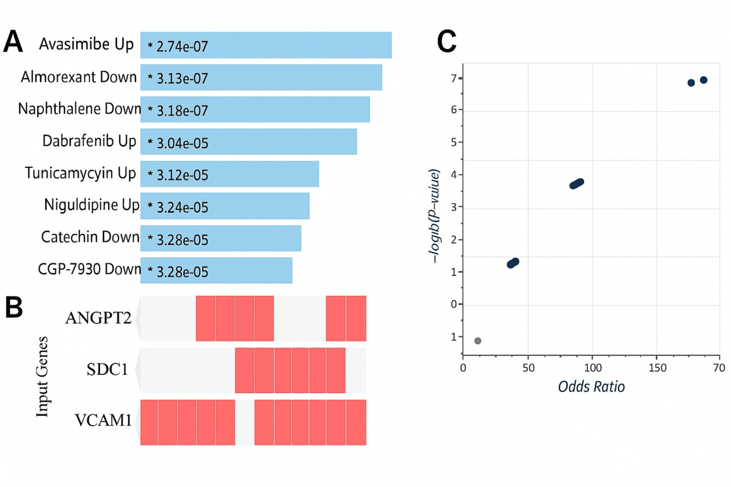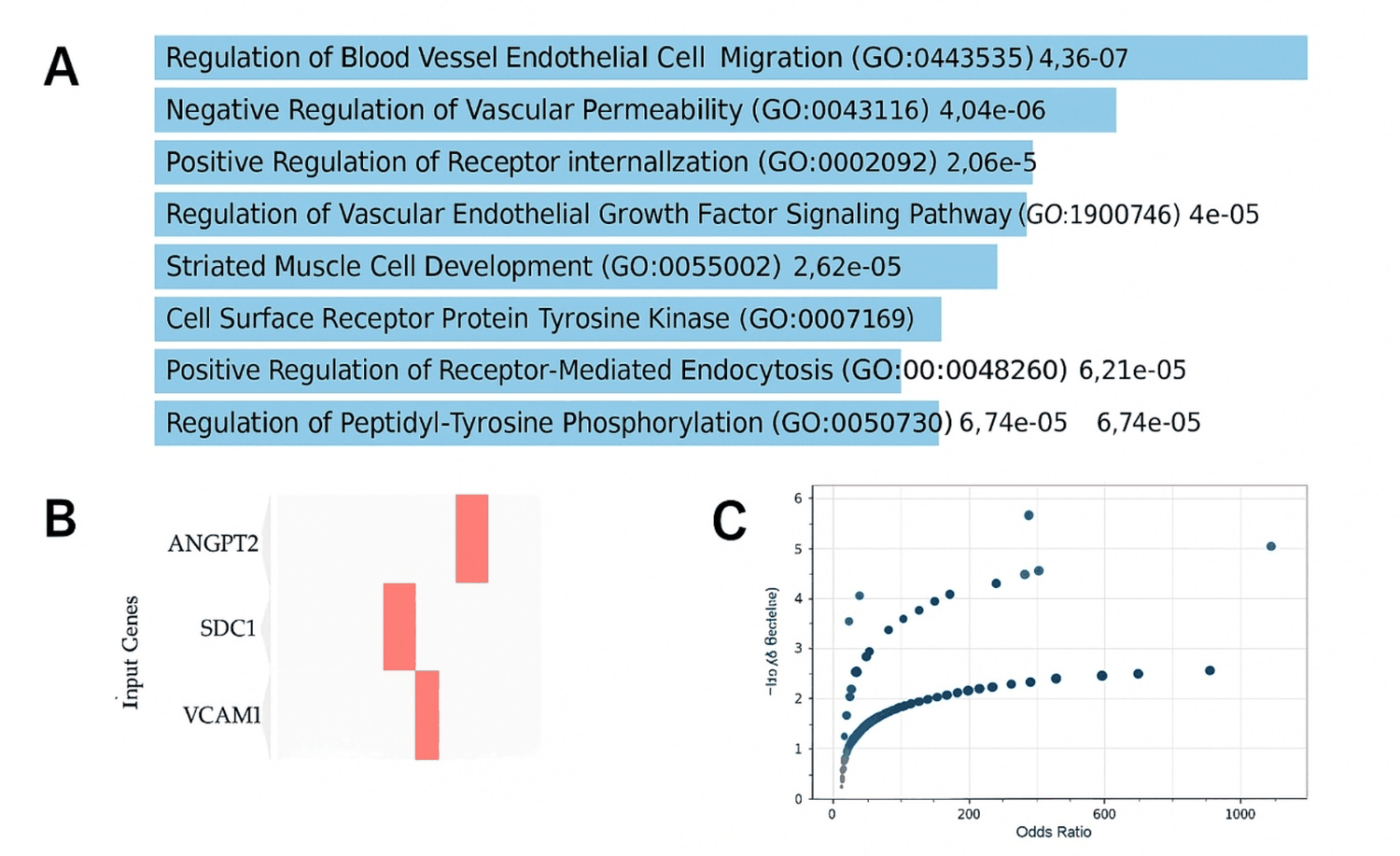 Figure 3: GO enrichment of the six-gene dengue hemorrhagic fever signature. Gene set: ANGPT2, SDC1 and VCAM1. Enrichment was performed in Enrichr (GO Biological Process 2025). P-values are from Fisher’s exact test; Adjusted P-values reflect multiple-testing correction; combined score is Enrichr’s metric integrating significance and effect size (z-score). (A): Horizontal bar plot of the top enriched GO terms ranked by significance; bar lengths represent -log10 (P), and each bar is annotated with the corresponding P-value; (B): Clustergram showing binary gene–term overlap (rows, input genes; columns, top GO terms); (C): Scatter plot of Combined score versus -log10 (Adjusted P), visualizing the joint relationship between significance and magnitude across the leading terms. View Figure 3