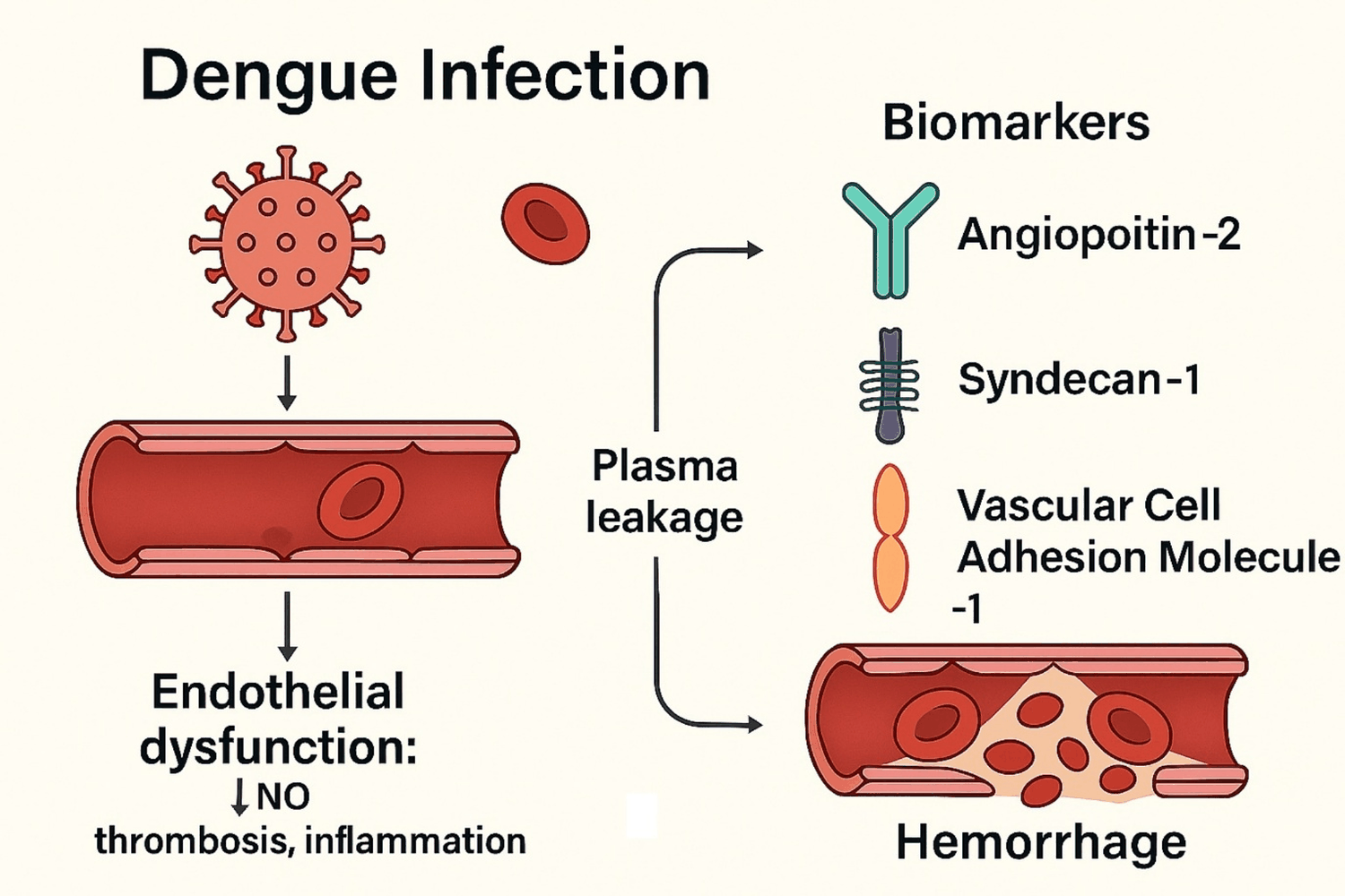 Endothelial dysfunction is central to dengue pathogenesis. The endothelium regulates barrier integrity, vascular tone, and leukocyte trafficking. In severe dengue, pro-inflammatory cytokines, viral proteins, and immune complexes trigger endothelial activation, leading to junctional disruption, glycocalyx degradation, and loss of barrier function [2]. This cascade results in plasma leakage, hypovolemia, and hemodynamic collapse-hallmarks of DHF/DSS. Endothelial dysfunction also perturbs nitric-oxide bioavailability, increases oxidative stress, and promotes coagulation abnormalities, further compromising cardiovascular homeostasis [3].