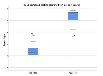 Univariate analyses were not normally distributed, and the Wilcoxon Rank Sum Test was used to analyze HIV knowledge improvement. Mean test scores increased from 27.97% to 87.61% after the training sessions were completed. The Wilcoxon Rank Sum Test confirmed these increases and showed a very high level of statistical significance (p < 0.001) between the pre and post-test measurements. Overall, the training equipped diverse community leaders with certification to provide HIV counseling and testing.