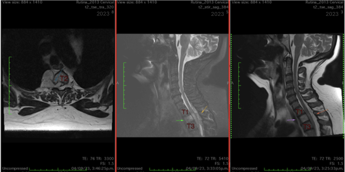 Clinical Presentation: This case involves a 56-year-old female patient presented to the clinic with complaints of persistent cervical pain and predominant weakness in the lower extremities over the past three months. Physical examination revealed clinical signs at the dorsal level. Further imaging revealing a lesion within the spinal canal exerting a mass effect on neural structures. An elective procedure was performed, including a fluoroscopy-guided laminectomy at the previously identified affected level (T2), the lesion was completely removed. At the two-week follow-up visit, the patient reported significant symptom improvement.