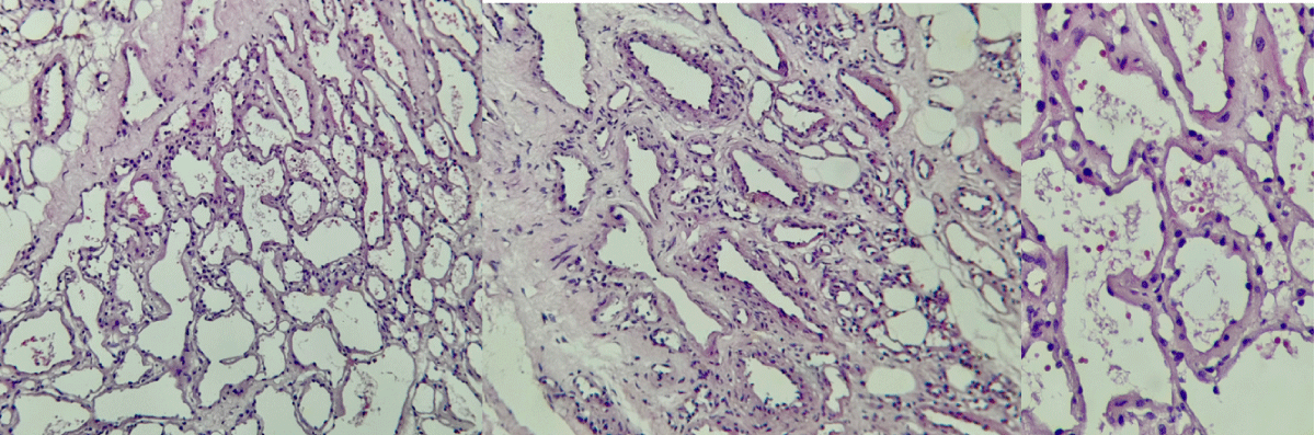 Figure 2: Histological slides (hematoxylin and eosin). A) Panoramic view that shows dilated lymphatic vessels; B) Lymphatic channels surrounded by scant fibrosis with some lymphocytes; C) Lymphatic spaces lined by flattened endothelium, filled with eosinophilic-proteinaceous fluid.