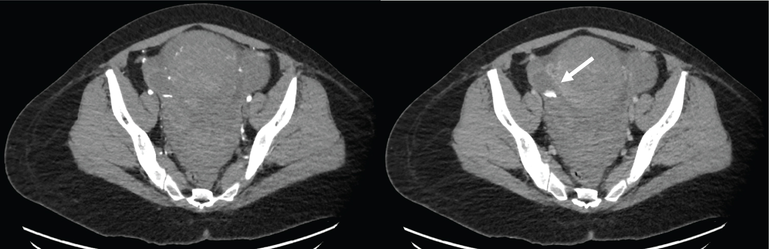 Figure 1: a) Axial early arterial phase; b) Portal venous phase images show contrast extravasation related to active bleeding in the right periuterine region (arrow).