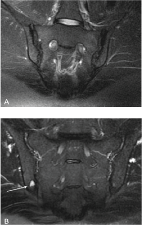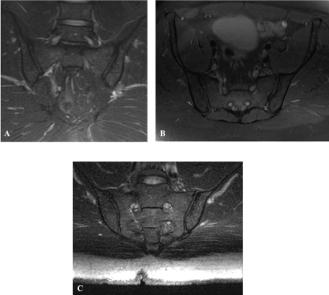 Radial MRI scans were evaluated according to signal changes within the SIJs. Normally, the SIJ space has a symmetric and homogeneous signal intensity in all sequences. An atypical signal intensity pattern of the joint space includes an intermediate signal on T1-W images and a high signal on T2-W and PD images [19]. Examples of focal, high T2-W signal changes are shown in Figure 2B and were confined to the inferior portion of the articular margin of the right iliac bone, indicating a focal area of subchondral edema and erosion. The high T2-W signal suggested active disease. Generally, most incidences of SIJ abnormalities were evident on the radial MRI scans and were depicted as abnormal signal changes within the joint and surrounding bone.