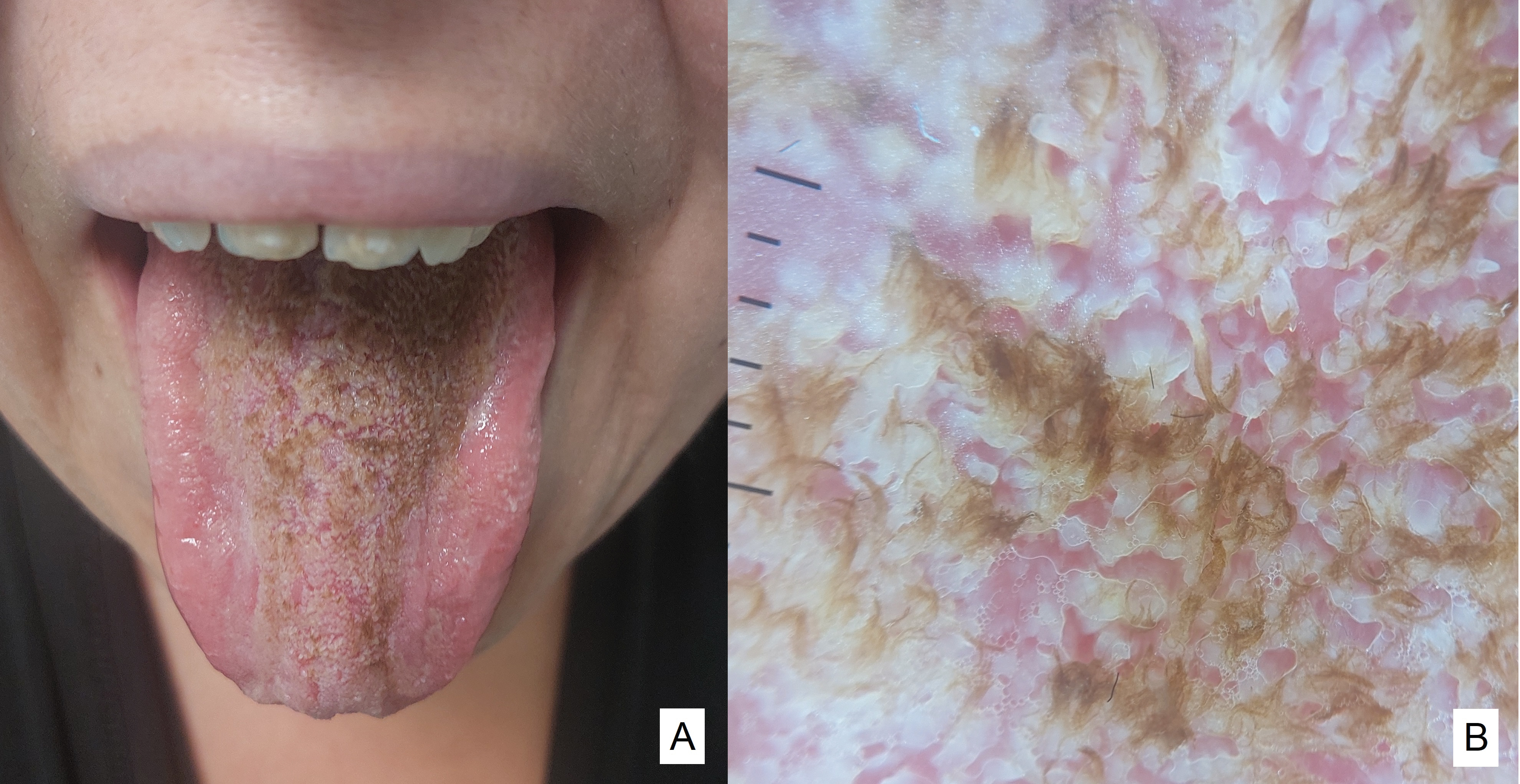 The authors present the case of a non-smoker, 40-year-old woman, with hidradenitis suppurativa (IHS4 9). When she presented for deroofing surgery she complained of an asymptomatic dark pigmentation of her tongue. She recalled three similar self-limited episodes, that coincided with doxycycline cycles, but denied a similar reaction when she took minocycline. A diagnosis of hairy black tongue induced by doxycycline was made and the patient was reassured (Figure 1). Dermoscopy with DermLite DL4 (CREUP TECHNOLOGIES LTD., Shenzhen, China), revealed brownish hair-like elongation of filiform papillae with whitish lingual papillae. A fungal direct or culture exam was not undertaken. Complete resolution occurred in a few days.