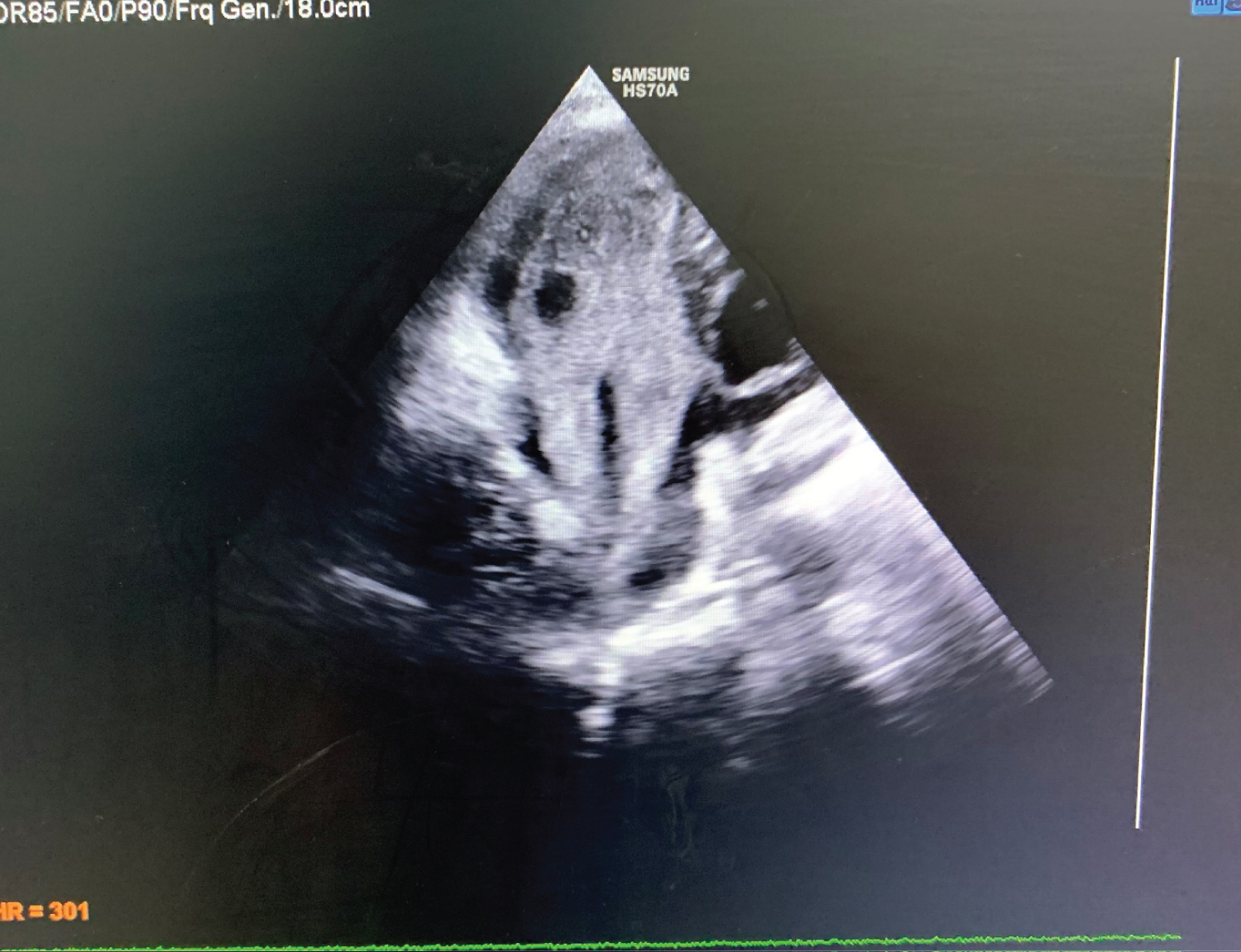 Figure 1: Showing large echogenic mass filling almost whole of right atrium and right ventricle.