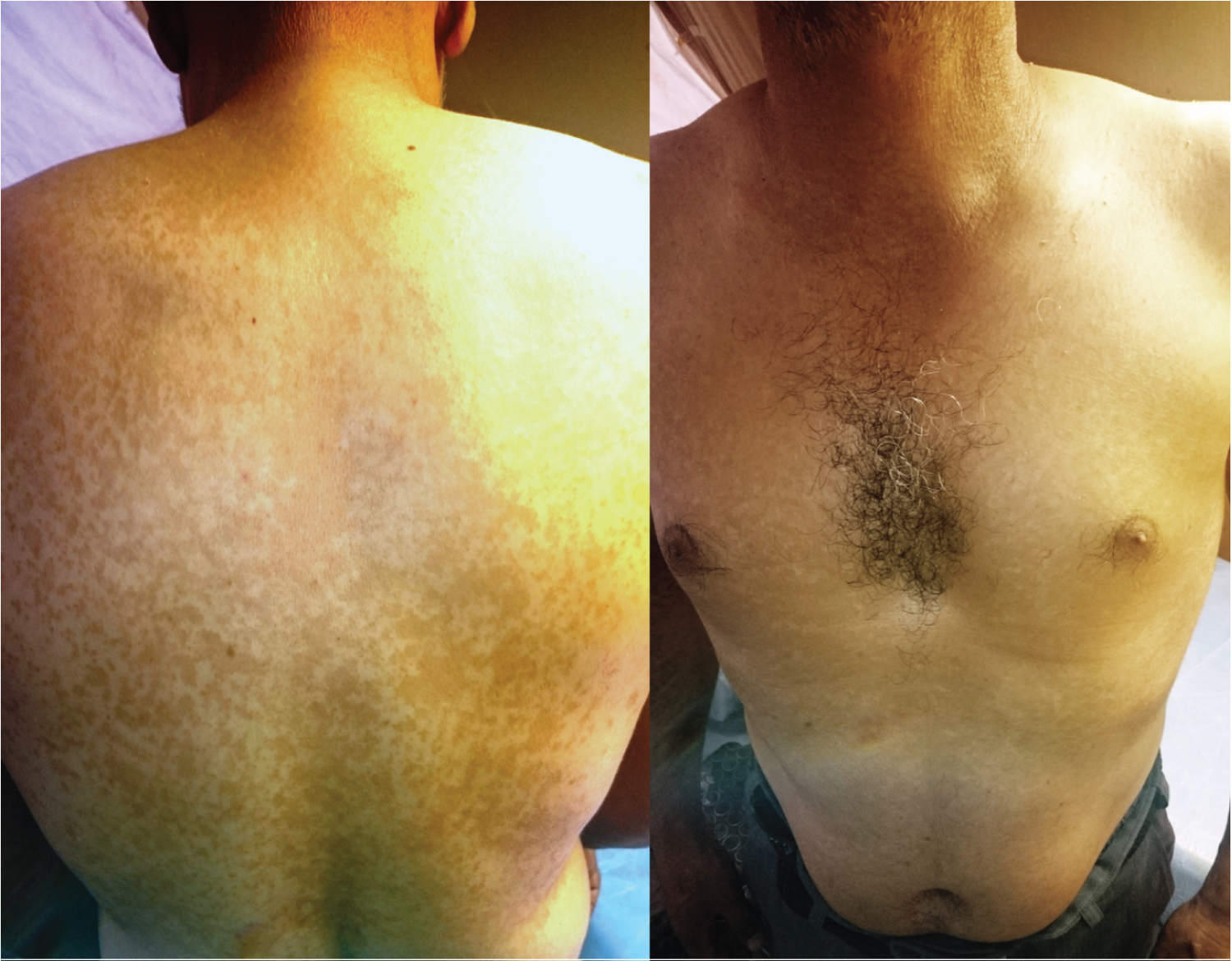 A 39-year-old patient, with a history of allergic rhinitis, presenting asymptomatic papular lesions for several years, starting in the pre-sternal region, then confluent in plaques and secondarily centrifugally extensive to the entire trunk. The patient received several antifungal treatments; especially ketoconazole; without any improvement. Clinical examination revealed brownish papulo-keratotic plaques of the pre-sternal, epigastric, interscapular and cervical regions, covered in palces with pityriasiform squamous, and extending at the periphery forming a reticular network reaching the shoulders, armpits and lower back (Figure 1). The rest of the clinical examination was without particularities. Evoked Diagnoses were pityriasis versicolor, seborrheic dermatitis, acanthosis nigricans, Darier's disease, macular and pigmented amyloidosis, or confluent and reticulated papillomatosis of Gougerot and Carteaud (Gougerot-Carteaud Syndrome). Direct mycological examination and culture in search of Malassezia were negative. Histology showed hyperkeratosis with focal parakeratosis, a discrete, irregular and inconsistent acanthosis, and the superficial dermis was seat of a subtle peri-vascular lymphohistiocyte infiltrate. PAS and Congo red stains were negative. The diagnosis of confluent and reticulated papillomatosis of Gougerot and Carteaud was retained, and the patient placed on doxycycline at a rate of 100 mg/day.