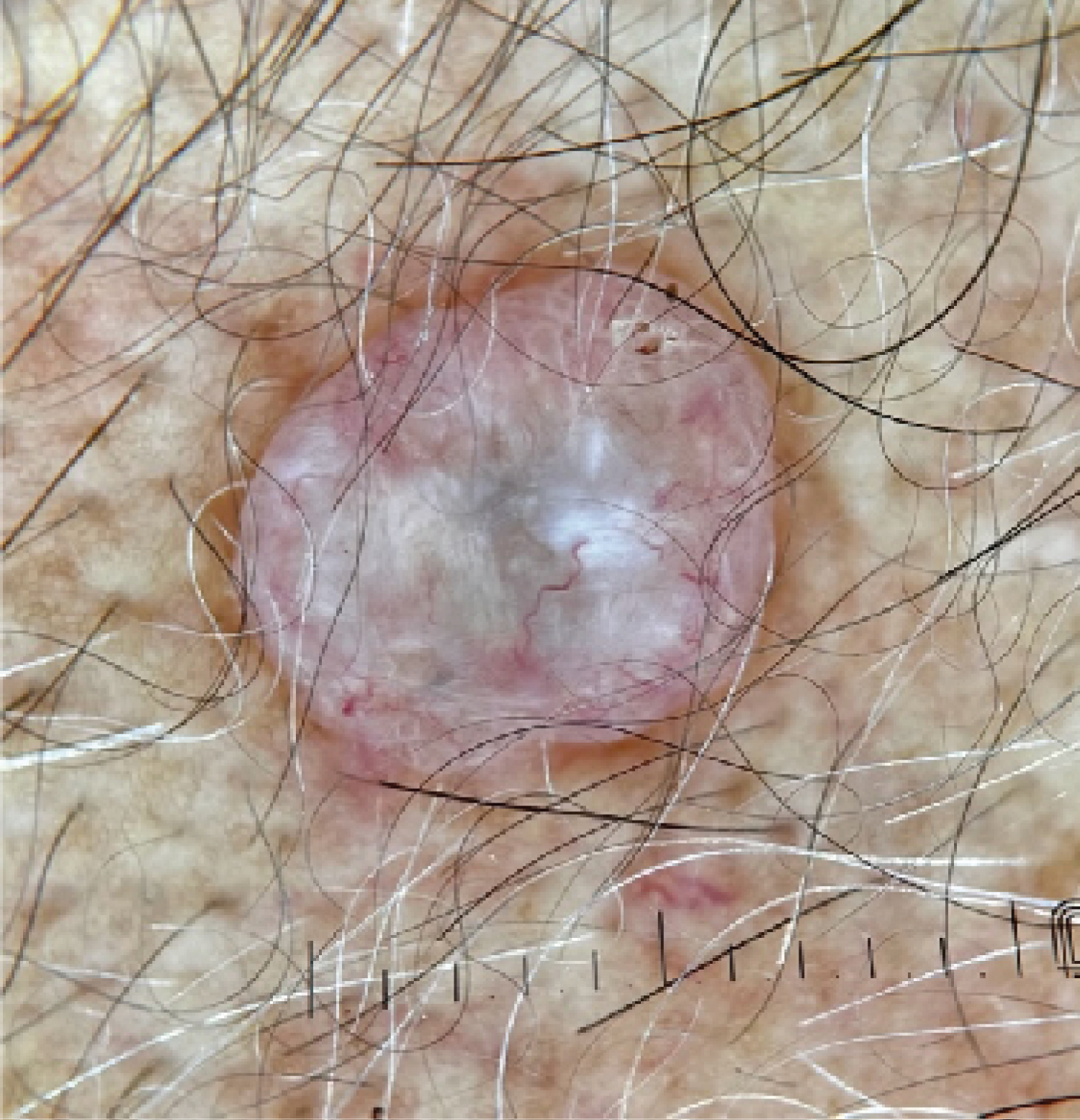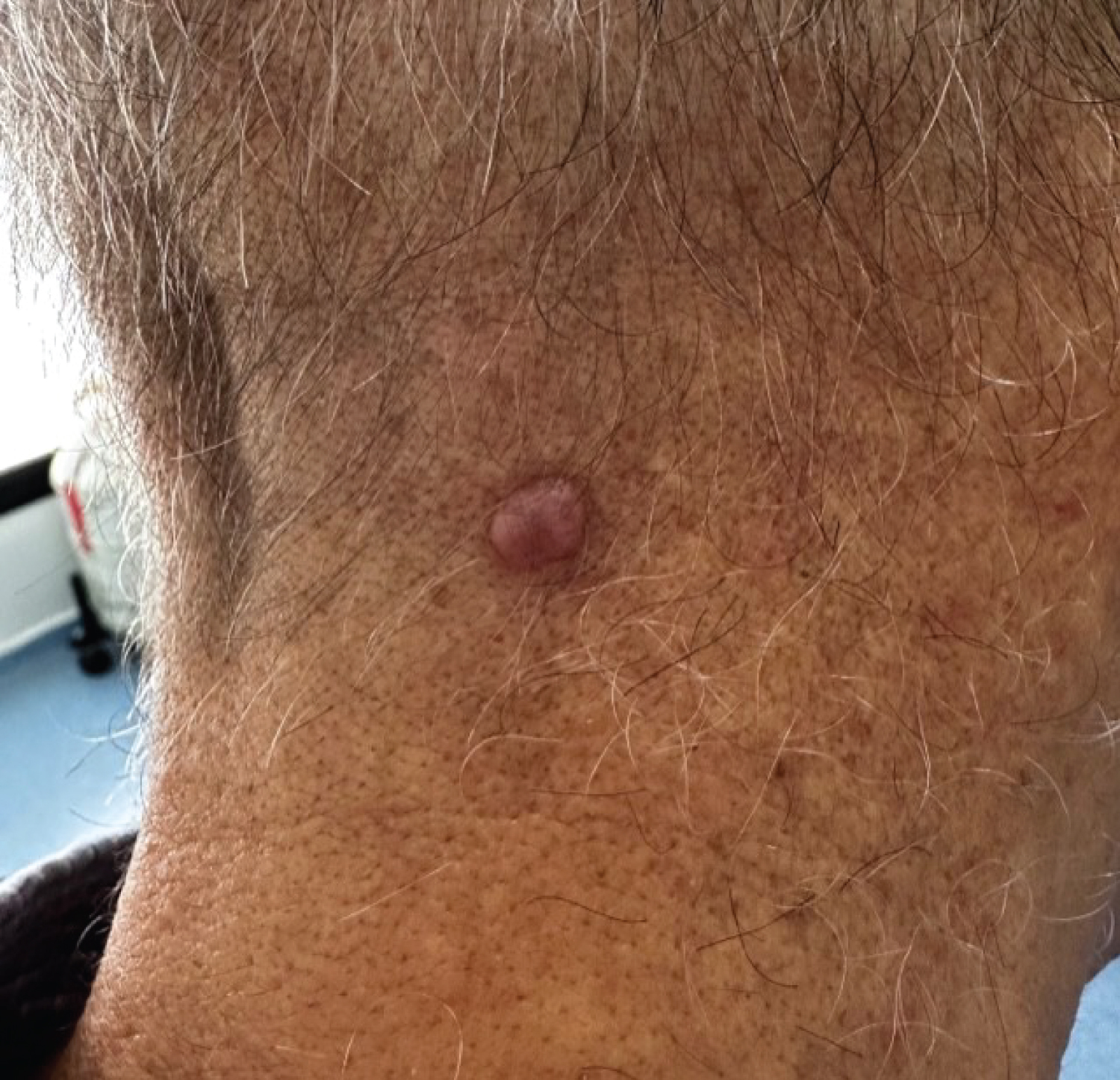 A 65-year-old hypertensive man followed up in dermatology for papulo pustular rosacea. On clinical examination, a well-limited, centimetric, asymptomatic, pinkish nodular lesion was found in the right occipital region, which had been evolving for several months (Figure 1).
