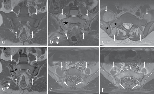 Figure 1: Coronal T1 weighted image (a), coronal (b) and axial (c) T2 weighted images, contrast enhanced coronal T1 (d) and fat saturation axial (e,f) T1 weighted images show the bone marrow oedema in right sacroiliac joint (star), overlying soft tissue swelling, right gluteal muscles abscess (arrowheads) and multilocular abscess involving the bilateral sacroiliac joint (arrows). Contrast enhancement was seen in bone marrow eodema regions compatible with sacroilitis (star). Fluid collections competible with multilocular abscess was showed peripheral enhancement (arrows).