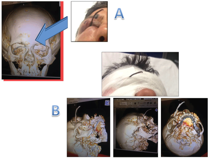Figure 1: Panel A Three-dimensional computed tomography. We find a metal wire that protrudes outside for about 5 cm and penetrates into the entry point into the right orbital cavity; Panel B Three-dimensional computed tomography images showing the penetration of the metal wire inside the orbital cavity and its relationships with bones, intracranial and vascular structures.