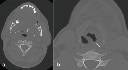 Figure 1: a) At the level of the tongue base, heterogeneous hypodense soft tissue thickening narrowing the air column is seen in the left portion of the oropharynx (arrow); b) Left pyriform sinus is seen as obstructed (arrow).