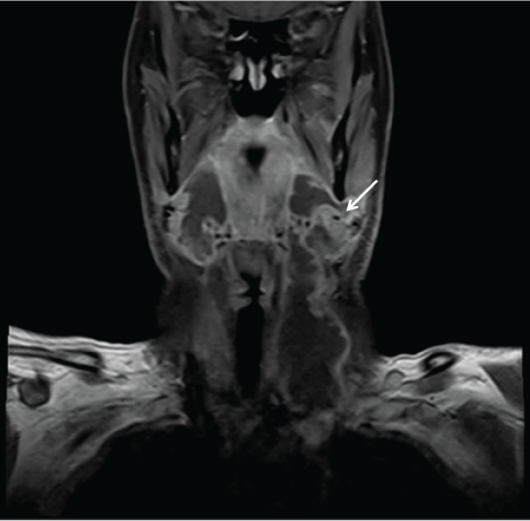 Figure 3: On coronal plane; Diffuse soft tissue swelling and abcess in the left peritonsillar area is seen (arrow).