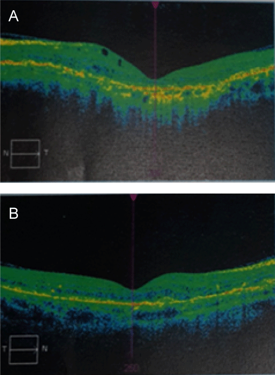 Figure 2(a,b): Optical Coherence Tomography (OCT) showing subretinal choroidal involvement (neo-choroidal vessels).