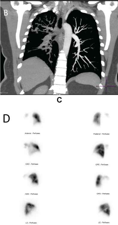 A 53-year-old female presented chronic dry cough and mild dyspnea, for 6 months. Due to an erroneous interpretation of CT findings (Figure 1A), she was diagnosed as pulmonary embolism, but without improvement with 6 months of anticoagulation. Evaluated at our service with progressive dyspnea, CTPA demonstrated complete occlusion of the right pulmonary artery (Figure 1A and Figure 1B). At echo, initial systolic pulmonary artery pressure 30 mmHg, not suggestive of pulmonary hypertension. A biopsy of the right pulmonary artery demonstrated the presence of choriocarcinoma. Chemotherapy was initiated with bleomycin, etoposide, cisplatin and, finally, dactinomycin. After treatment, patient remained asymptomatic, beta-HCG decreased from 198.374 mUI/ml to 1.8 mUI/ml. After a 5-year follow-up, neither return of the disease (Figure 1C), nor signs of pulmonary hypertension were characterized (normal echo and BNP), despite the vascular perfusion defect of the right lung on V/Q scan (Figure 1D). Pulmonary hypertension occurs when more than 60% of the lung vascular bed is impaired [1]. In this case, despite the sequel on right pulmonary artery at long-term, micro-vasculature is preserved. Therefore, right pulmonary artery occlusion is not enough, per se, to induce pulmonary hypertension. Up to this date, the patient is fine without specific pulmonary hypertension therapy and remains at clinical follow-up.
