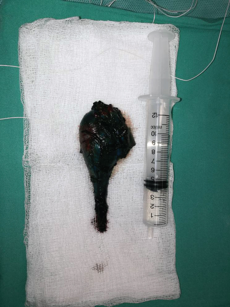 A 25-year-old gentleman presented with recurrent right lower neck swelling for 2 years. The recurrent attack of infections were always precipitated by upper respiratory tract infection. On clinical examination, there was a cystic swelling located at right lower neck, and anterior to sternocleidomastoid muscle. It measured 5 cm by 5 cm in diameter, with a sinus opening (Figure 1). Computed Tomography fistulogram of the neck showed similar findings that was suggestive of branchial cleft cyst without fistula seen. He underwent surgical excision with intralesional injection of methylene blue via the sinus opening. This technique is adopted to help define the extent of the cyst because identification of complete cyst wall was challenging due to fibrosis from recurrent infections. Total 5 mls of dye was injected and excision was performed via step ladder technique. The cyst was removed completely (Figure 2). At about 6 hours postoperatively, she started passing out blue-coloured urine (Figure 3) associated with nausea and vomiting. She was managed conservatively with adequate intravenous hydration and monitored closely for neurotoxicity. Her urine returned to normal after 24 hours and was asymptomatic. Methylene blue is commonly used in surgical fields to help identify targeted organs or structures. In the case of branchial cleft anomalies, it is a good tool to define the extent of the swelling to ease surgery and achieve complete excision particularly in the background of recurrent infections. Methylene blue is filtered via kidney. Despite its rarity, adverse effects such as neurotoxicity and cardiac toxicity may still occur.