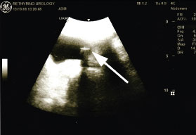 Figure 1: Sagittal ultrasonographic plane of the patient's bladder. The foreign body creates the characteristic acoustic shadow (white arrow).