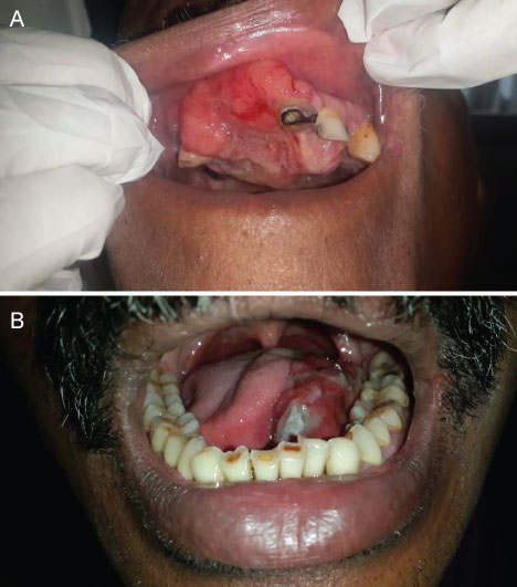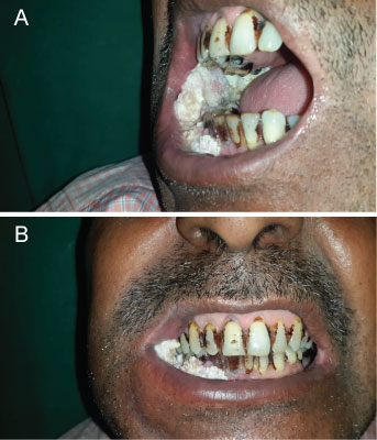 Figure 1: A) Shows oral cancer (T4a N1M0) along with trismus. The tumour has invaded the anterior aspect (Between teeth number 41-32) of the mandibular bone on one side extending upto the left corner of the mouth involving the lower anterior labial sulcus and inferior labial sulcus. A single lipsilateral submental node is involved Facial; B) Shows stage T2 of oral cancer (T2N1M0). The tumour extends from tooth number 13 to 24. The teeth also show cervical abrasion. Nodal involvement is as above.