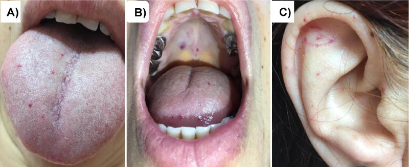 During his physical exam, we noticed telangiectasia lesions spread throughout her lower lip, tongue (Figure 1A), face, soft palate (Figure 1B) and outer ear (Figure 1C). Doing anterior rhinoscopy, we noticed hematic points on her septal mucosa and her right middle turbinate.