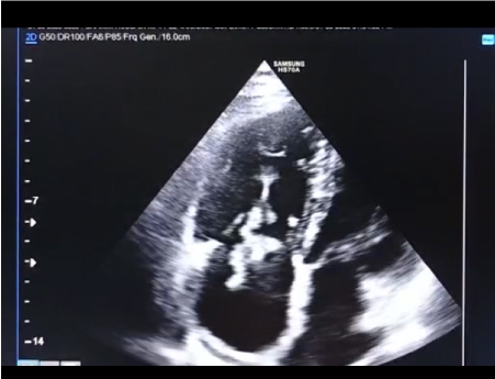 Figure 1: Depicting the pacemaker lead vegetation which is visible from RA to RV attached with the RV lead.