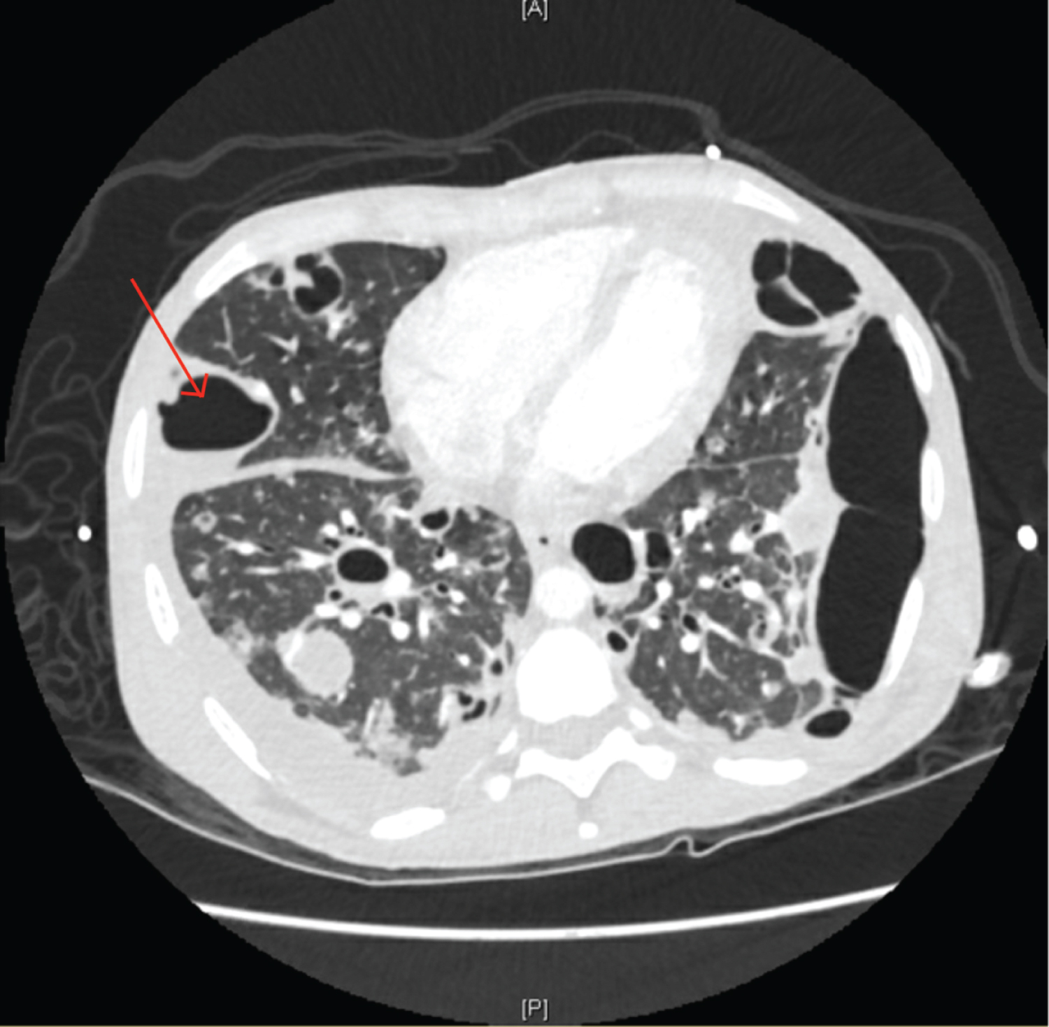 Figure 4: CT scan of the chest with arrow pointing to the cavity that later ruptured. Left sided cavity spanning entire left lung border.