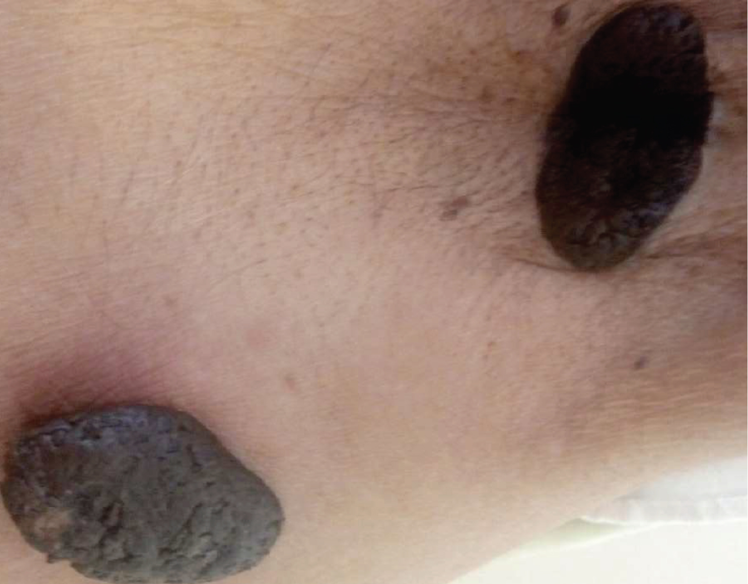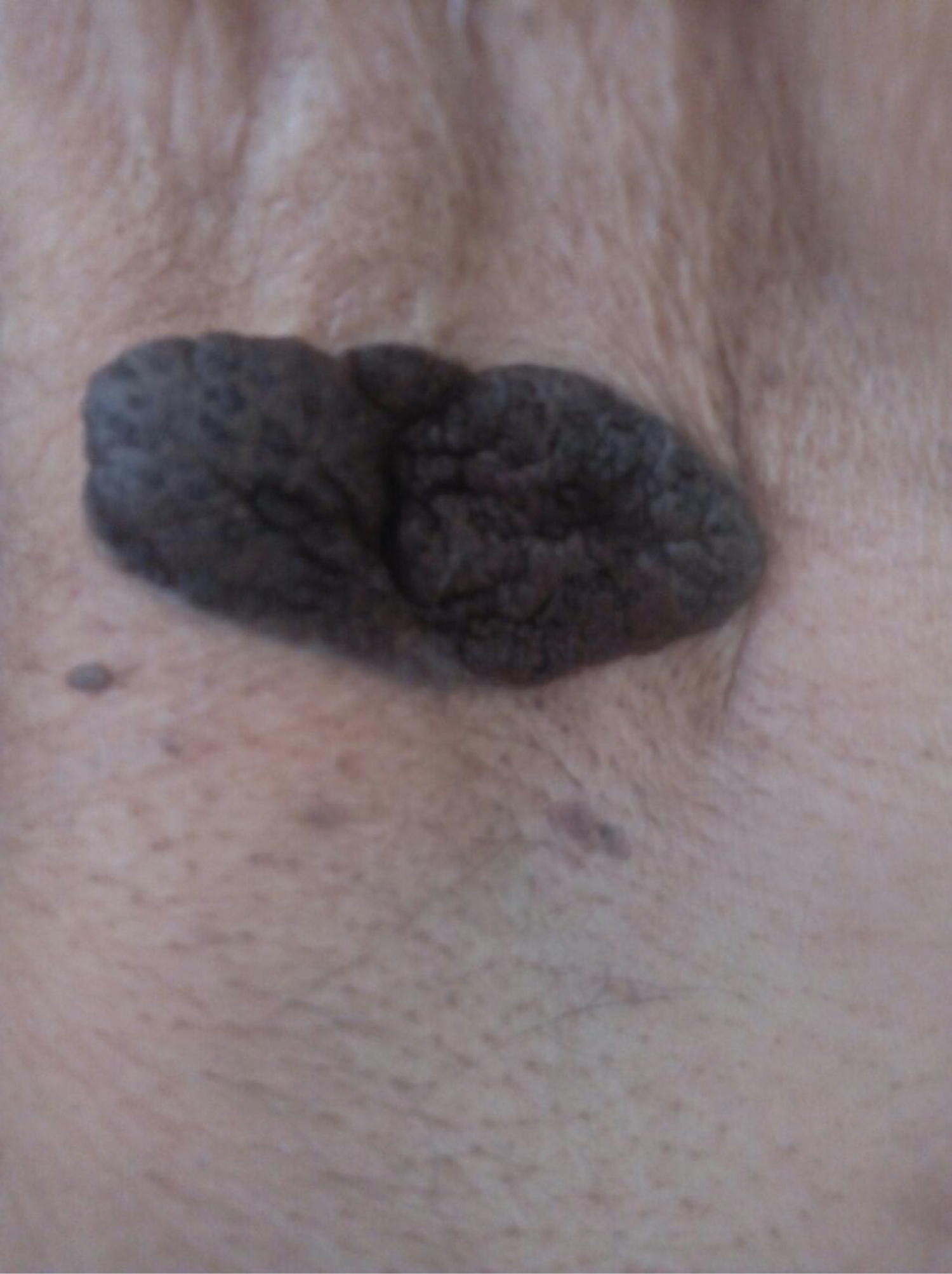We report the case of a 90-year-old man, with no particular past medical history, who presented with asymptomatic axillary lesions evolving over the last twenty years. Clinical examination showed four dented hyperpigmented tumours and very limited cerebriforms measuring 12 cm along its longer axis (Figure 1 and Figure 2). Dermoscopic examination showed cerebriform convolutions appearance suggesting seborrheic keratosis. Histology confirmed the diagnosis, without signs of viral infection or malignant transformation. The patient underwent surgical resection resulting in permanent scar.