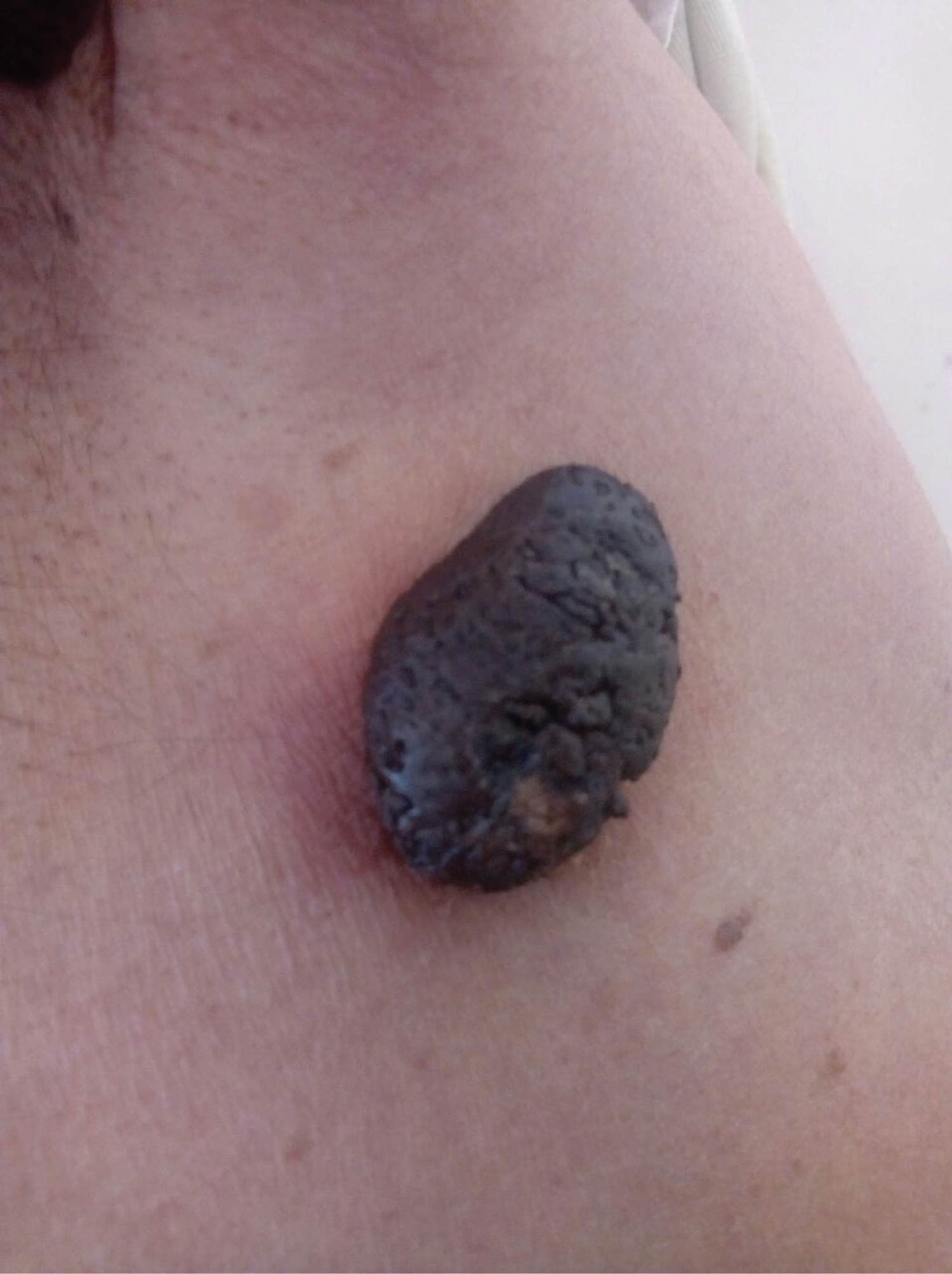 Seborrhoeic keratosesis a benign skin tumor, which mainly occurs in people aged over 50 years. It is common on the trunk and face [2,3]. Despite the frequency of seborrheic keratosis, little is known about the epidemiology of the disorder. It is believed to be more prevalent among Caucasians and to affect roughly equal numbers of men and women. It is also generally acknowledged that its prevalence increases with advancing age. One Australian study reported a 100% prevalence of seborrheic keratoses among people over age 50. On average, 69 seborrheic keratoses were found per patient in those over age 75. Seborrheic keratosis is also known by various synonyms: Verruca senilis, senile wart, verruca seborrhoica, seborrheic wart, basal cell acanthoma, benign acanthokeratoma, and basal cell papilloma. The present paper uses the internationally prevalent term "seborrheic keratosis" to describe this highly common, benign epithelial skin tumor [4,5]. Lesions are sharply demarcated, round or oval-shaped, usually elevated and stuck on the skin with a verrucous, uneven, dull, or punched-out surface (Figure 3). Flat seborrheic keratoses often have a smooth, velvety surface and are barely elevated above the surface of the skin. Whether these flat forms are merely initial seborrheic keratoses, which grow thicker over time, or whether they are a sub-type is still unclear [6]. Some seborrheic keratoses have a surface which appears rather oily and shiny, hence the misnomer "seborrheic" (i.e., greasy) keratosis. Seborrheic keratoses typically appear as if stuck on the skin. Lesions range in size from a few millimeters to several centimeters, with a typical diameter of 0.5-1 cm. Lesions vary in color and may be skincolor/yellowish, gray-brown, or black [7]. Pediculated forms have also been observed in intertriginous areas. Seborrheic keratoses are often penetrated by invaginations of keratotic plugs and horn cysts (filled with concentrically attached keratin). On dermatoscopy these appear as "pseudofollicular openings" and "horn pseudocysts" with light, sharply bordered, round plugs. Inflammation around the margin of the lesion can occasionally occur (Meyerson phenomenon). Seborrheic keratoses can appear anywhere on the body with the exception of the palms or soles. The mucus membranes are also generally spared. The most commonly affected sites are the chest, back, head (near the temples), and neck [8]. The main differential diagnoses are condyloma, pigmented basal cell carcinoma and melanoma. The etiology of Seborrhoeic keratosesis unknown, although there may be some familial predisposition, which was not demonstrated in our patient. They could also occur after inflammatory dermatosis or at a site of repeated rubbing [9]. In fact, Seborrhoeic keratoses which are located on sites of chronic friction, such as shaving areas, or the folds of obese patients, can reach large dimensions, up to ten centimeters in diameter. This is illustrated in our patient who presented Seborrhoeic keratoses initially of small dimensions gradually increasing in size to reach 12 cm [10].