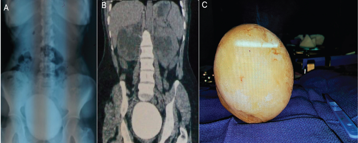 Figure 1: (A) (KUB) X-ray showing a pelvic projection calcification; (B) CT scan showing a bilateral uretero-pyelocalyceal dilatation upstream of a large bladder stone measuring 9 cm in diameter; (C) Lithiasis after extraction via open cystolithotomy.