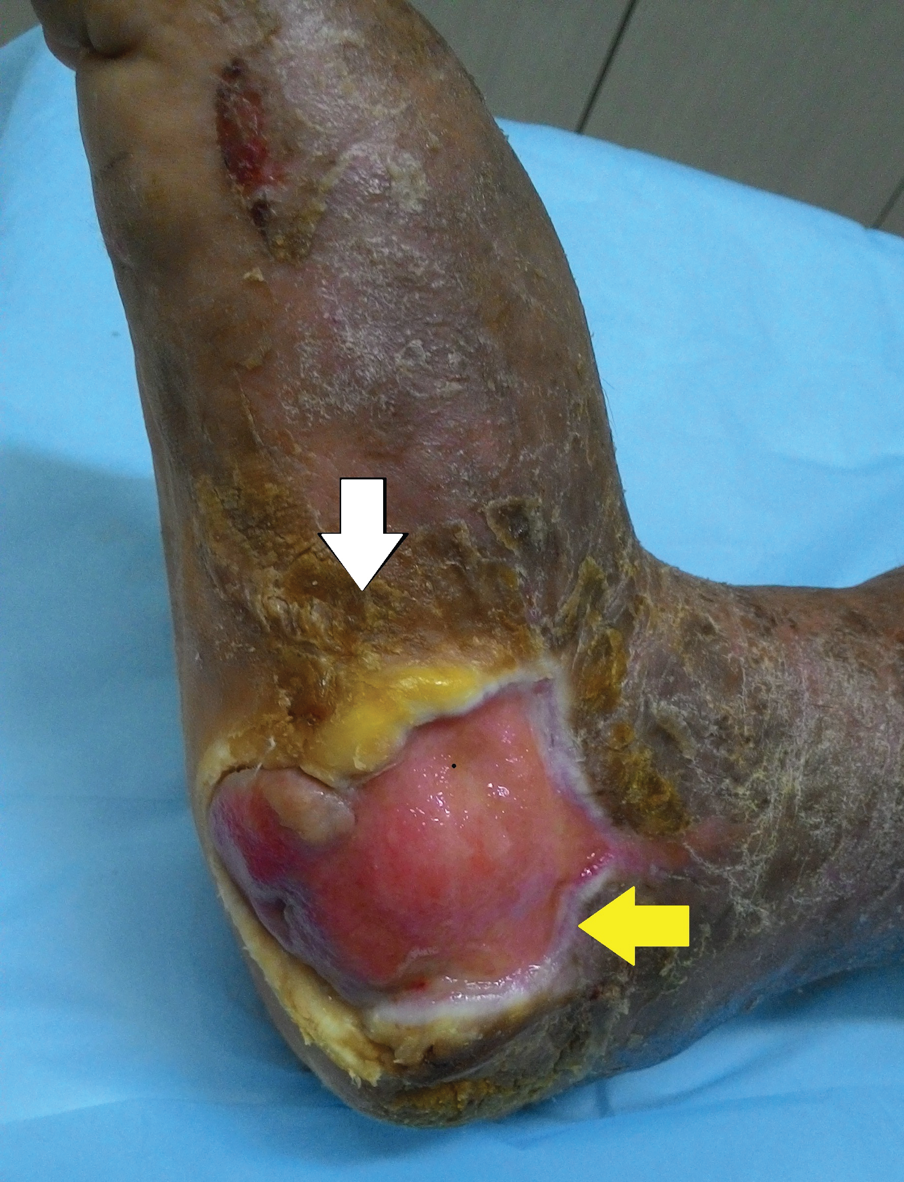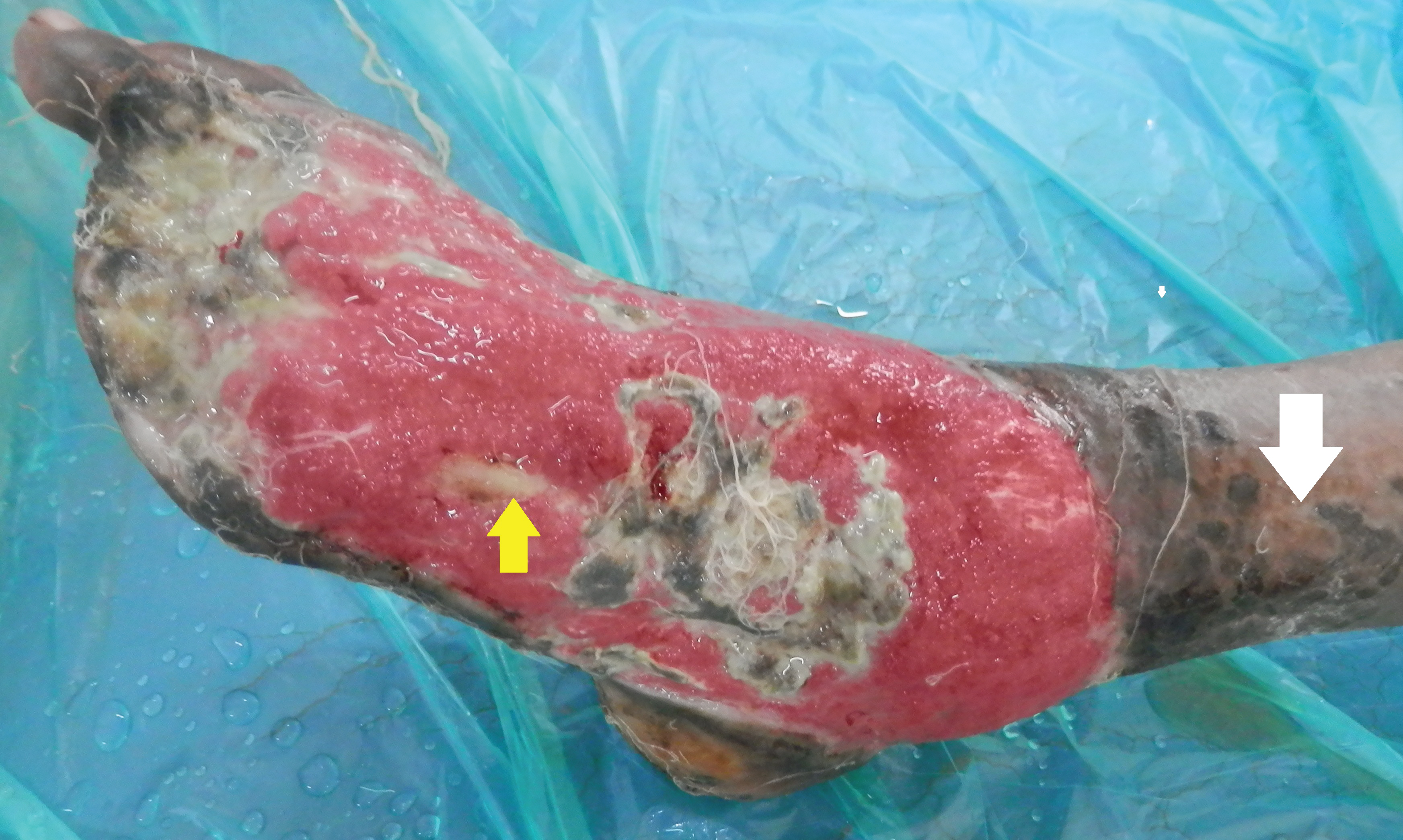 Figure 3: The ulcer shows lots of granulation tissue with an exposed tendon (yellow arrow) and adjacent dark pigmented gangrenous areas (white arrow).