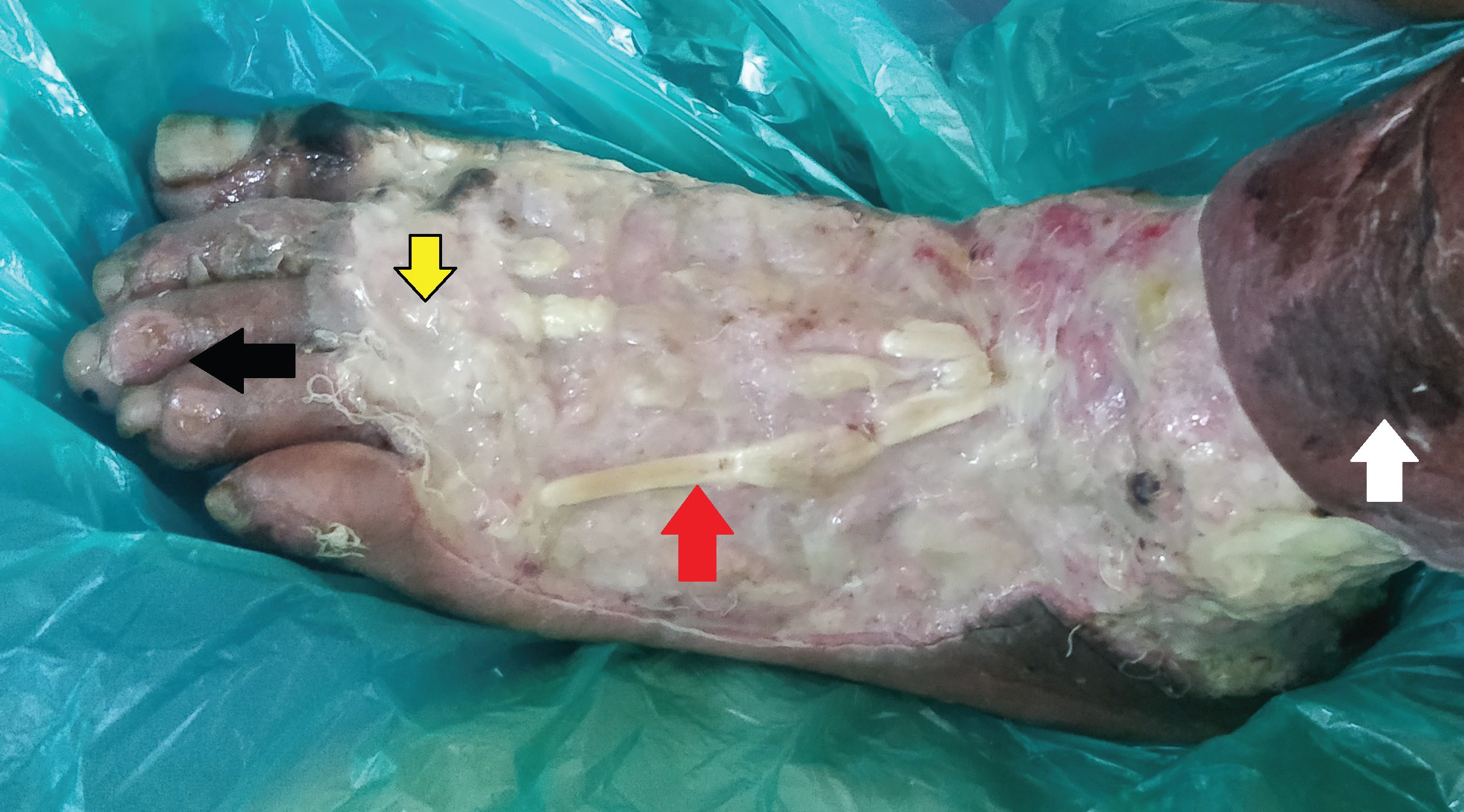 Figure 5: A large ulcer with white charred skin (yellow arrow) and exposed tendons (red arrow) can be seen. Surrounding areas show blackish burnt skin (white arrow) as well as exposed dermis (black arrow).