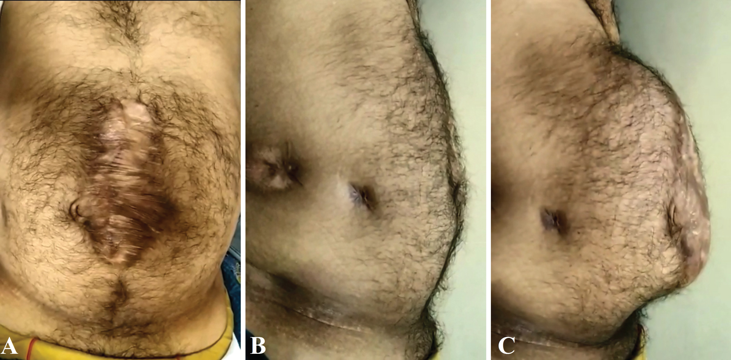 Figure 3: Front (A) and side (B) view of a patient with an anterior abdominal swelling at rest. A midline surgical scar can be clearly appreciated (A). Increase in size of swelling on coughing - positive cough impulse (C).