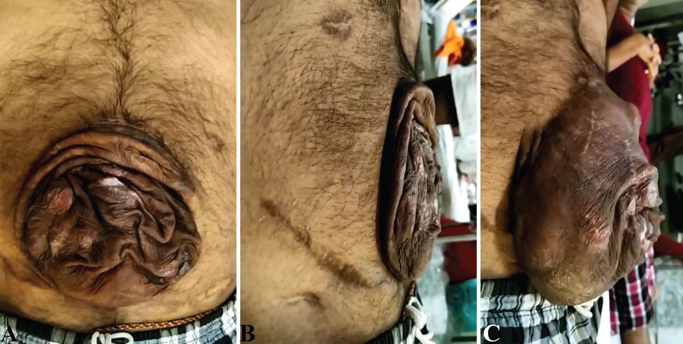 Figure 1 depicts a case of bilateral inguinal hernia with the scrotal swelling on the right side being larger than that on the left. Typical presentations include swelling in the inguino-scrotal region. The usual feature of identification for hernia apply here as well but this patient has a severely enlarged globular swelling that has made even the identification of penile shaft difficult. This is not usually seen in other causes of scrotal swelling such as testicular cancer or hydrocoele and it indicates that the contents of the swelling have come from outside the scrotal sac. This is a very useful visual identification feature. Hernias of this size tend to be irreducible. Another important visual finding in this case is the appearance of redness of the scrotal swelling. It is a sign of strangulation of hernia and warrants further physical examination to confirm the same.