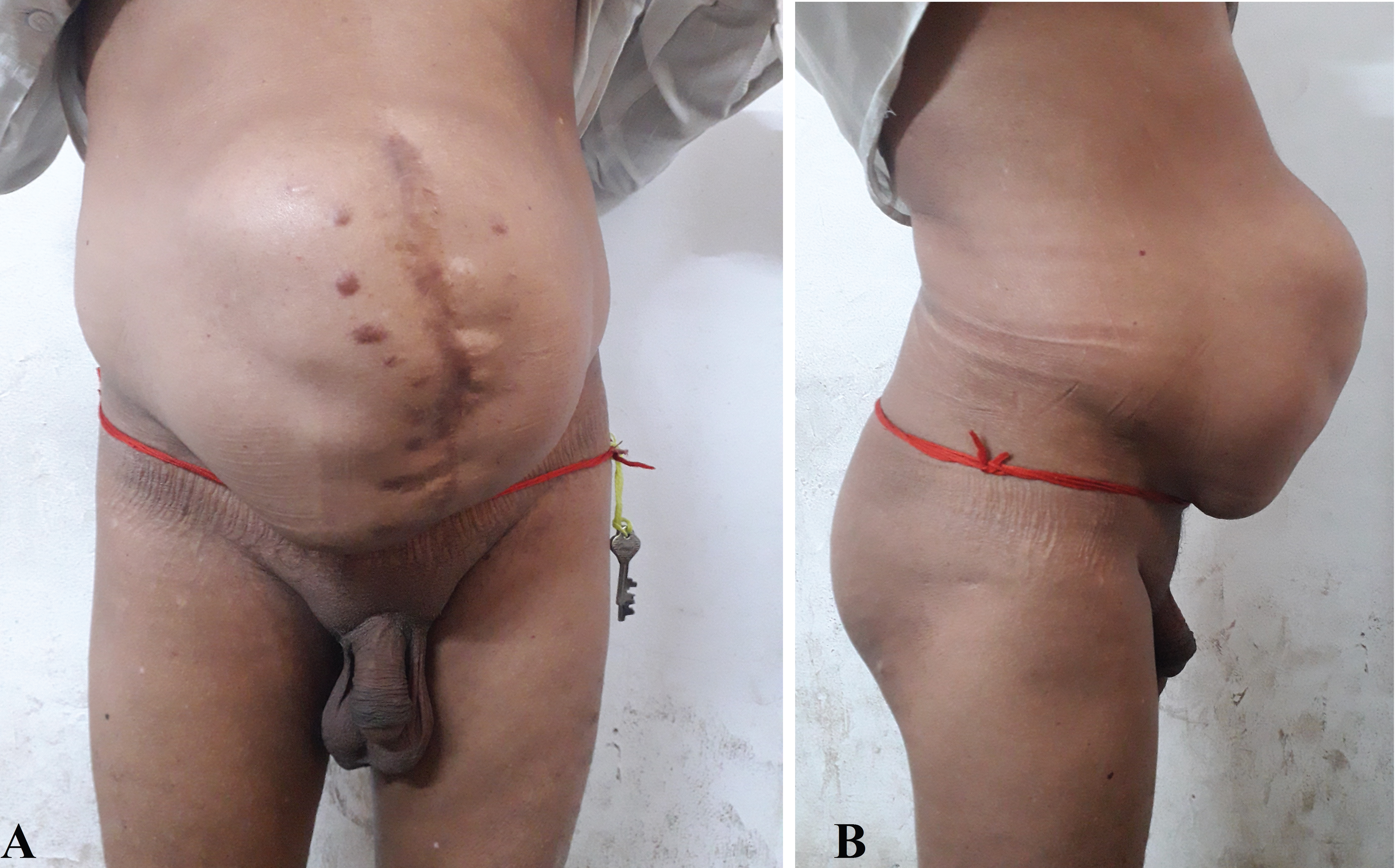 Figure 5: Large abdominal swelling with midline scar front (A) and side (B) view. A midline surgical scar can be clearly appreciated.
