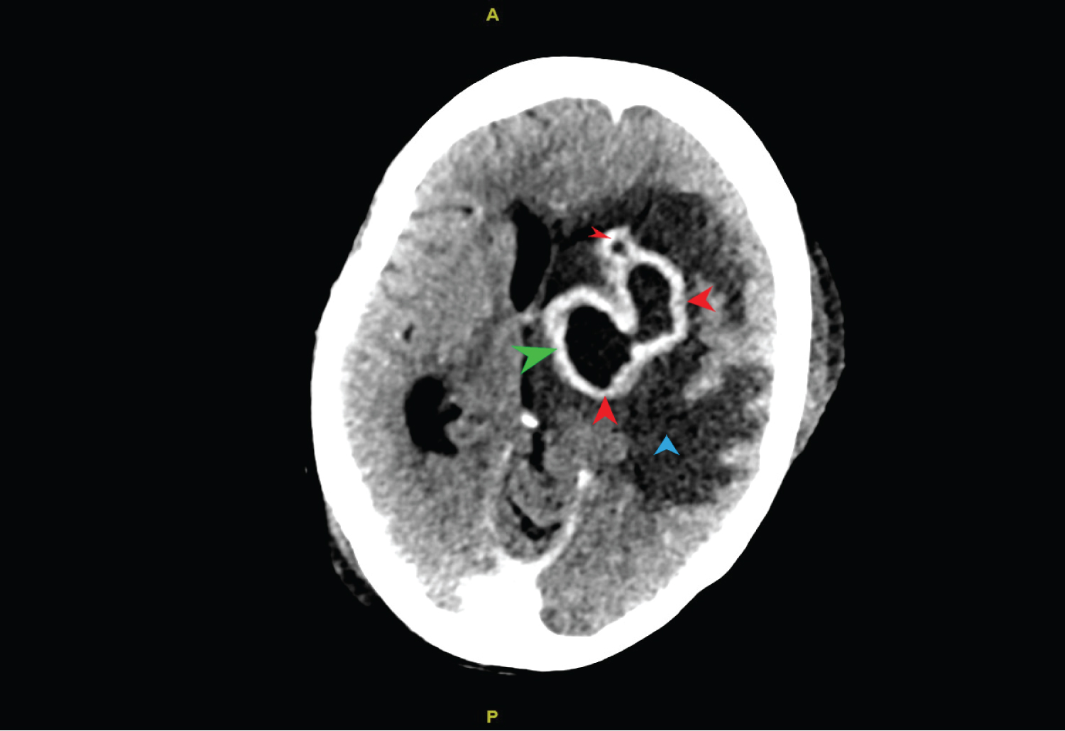 Figure 1: CECT head showing multiple irregular thick walled (green) peripherally enhancing lesion (red arrow) along with fronto-temporo-parietal infarct (blue arrow) with mass effect and midline shift.