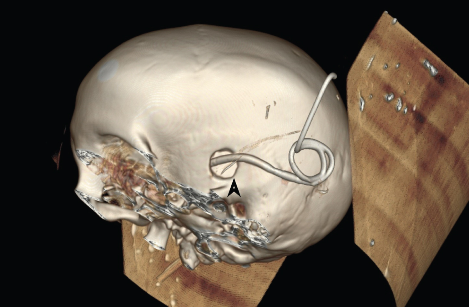 Figure 2: 3D representation of Skull showing burr hole and external ventricular drain in situ (black arrow).