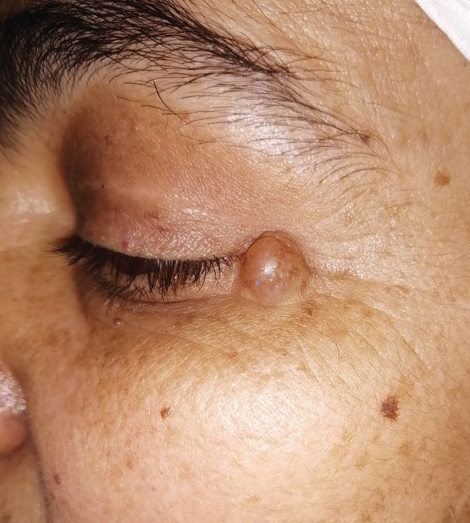 Figure 1: A small, translucent, soft, cystic papule measuring 3 mm × 3 mm on the left upper eyelid.