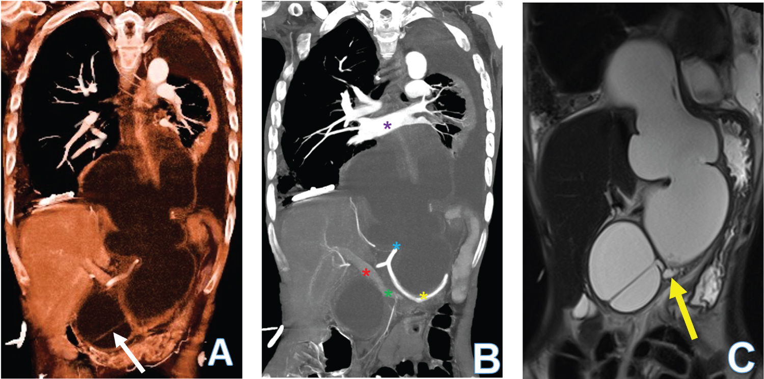 Figure 1: 38-year-old woman presenting with COVID-19 and a large pancreatic pseudocyst. (A) 3D reconstruction volume rendering using CT abdomen liquid algorithm shows a large, encysted fluid collection with septation. The epicenter is in the abdomen and extends into the posterior mediastinum primarily behind the left lung and bronchial tree. The pancreas is not seen separately; (B) CT scan 3D reconstruction using MipPR shows the relation of the pseudocyst with the celiac trunk (blue star), splenic artery (yellow star), main portal vein (red star), splenic vein (green star) and the pulmonary veins (purple star); (C) The MRCP study HASTE coronal image shows communication between the large cyst and the main pancreatic duct (yellow arrow).