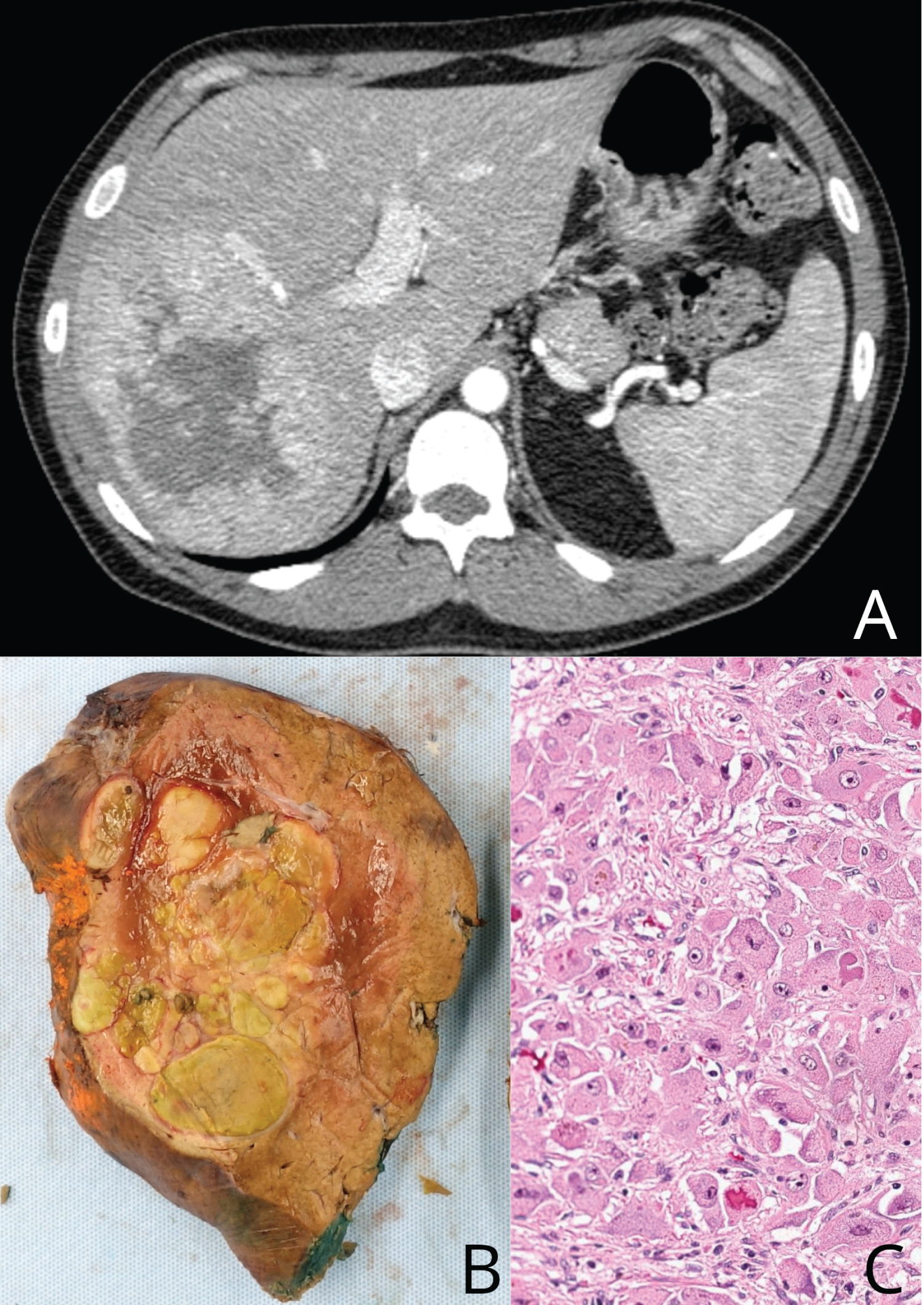 He underwent right hepatectomy and pathological examination demonstrated a solitary 10.5 × 10.1 × 7.0 cm fibrolamellar hepatocellular carcinoma with negative margins (Figure 1B and Figure 1C).