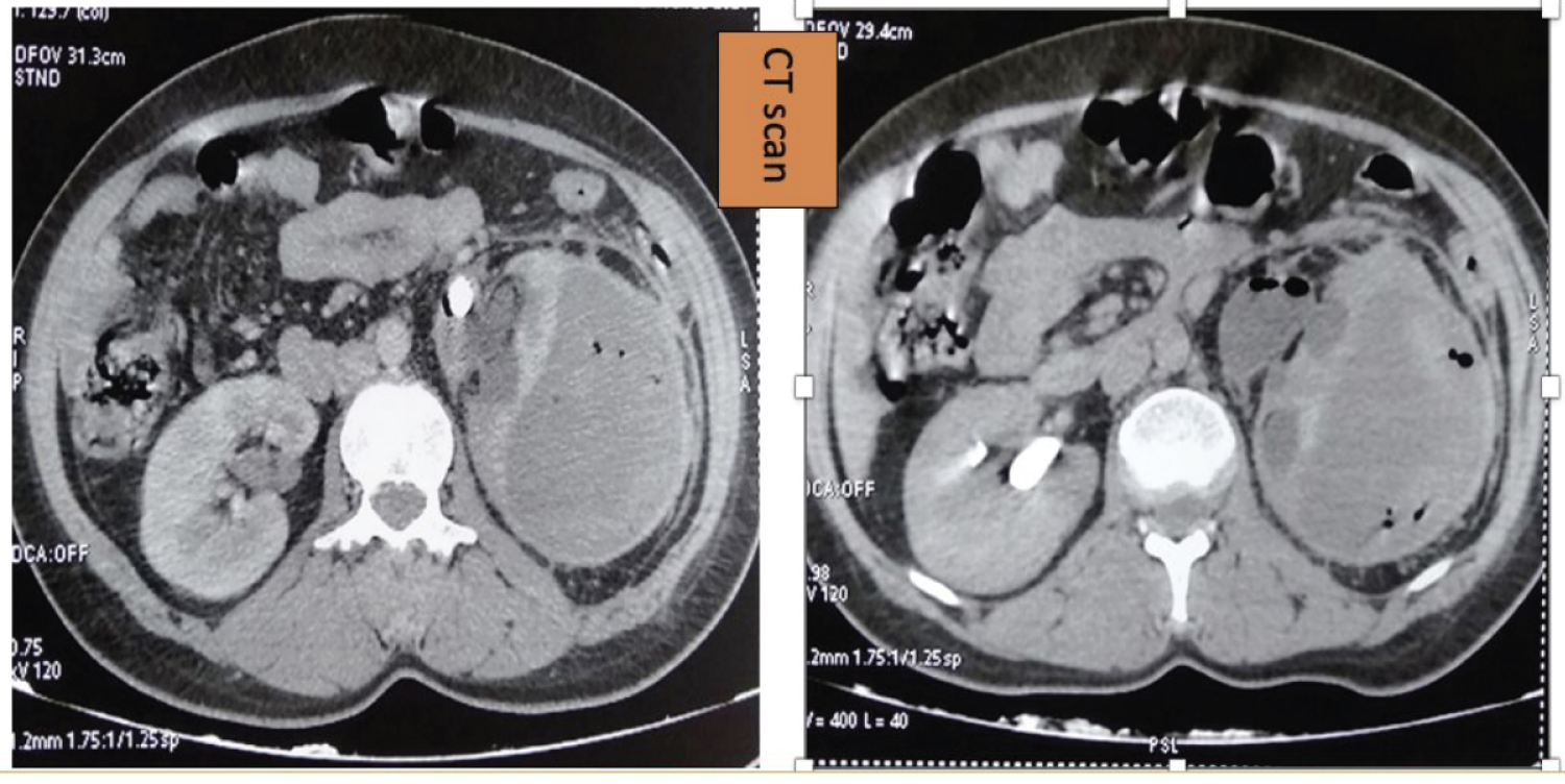 We report the case of a 41-year-old female patient, a known diabetic on insulin, who presented to the emergency department with left lumbar pain evolving for 3 days in a febrile context. She also reported irritative urinary signs associated with cloudy urine. On admission, performance status was 2, the patient was conscious with a temperature of 38.9 ℃ and significant pain on palpation in the left lumbar fossa. Emergency blood tests revealed an inflammatory syndrome and impaired renal function. Standard radiography revealed a stone in the left renal area. CT scan (Figure 1) revealed an enlarged kidney with pyelocalic dilatation upstream of a pyloric calculus, and a heterodense subcapsular perinephric collection of hematic density and multiple air bubbles. This collection measures 6 cm thick medially. There is also extensive infiltration of peri-renal fat. Emergency treatment consisted of a venous line and antibiotic therapy with ceftriaxone and amikacin, adapted to her renal function. She was rushed to the OR for a double-J catheter (purulent urine) and percutaneous nephrostomy. The final outcome was favorable, with improvement of clinical signs and normalization of biological parameters.