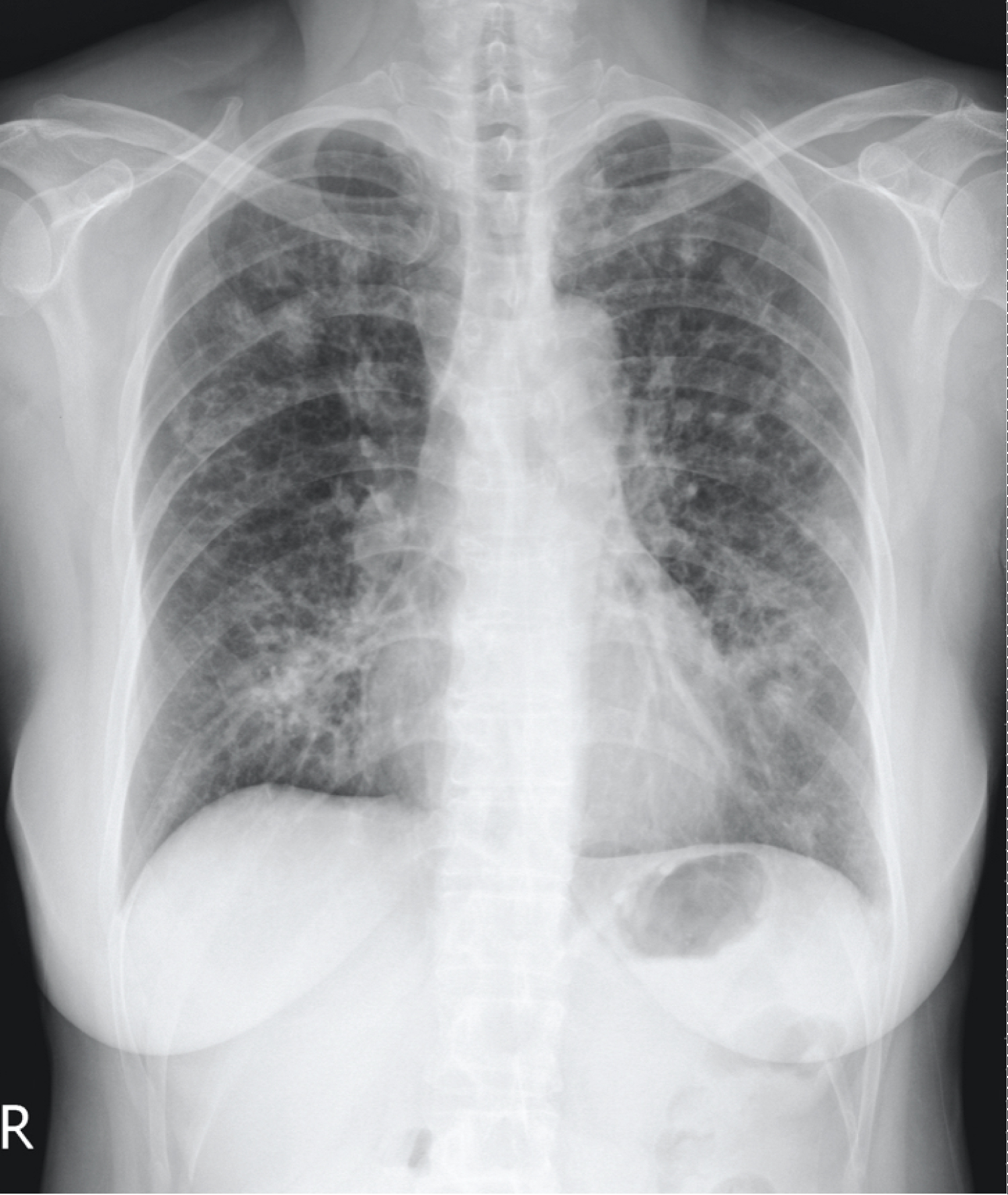 Figure 1: Chest radiography revealed multiple linear, nodular opacities, and infiltrates in both lung fields.