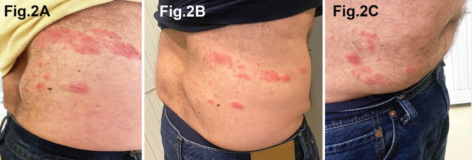 Figure 2: Photographs showing the skin rash at different stages of development in the posterior (A), lateral (B) and anterior (C) abdominal walls. The rash predominantly corresponds to the dermatomes of T10 to L1 spinal nerves.