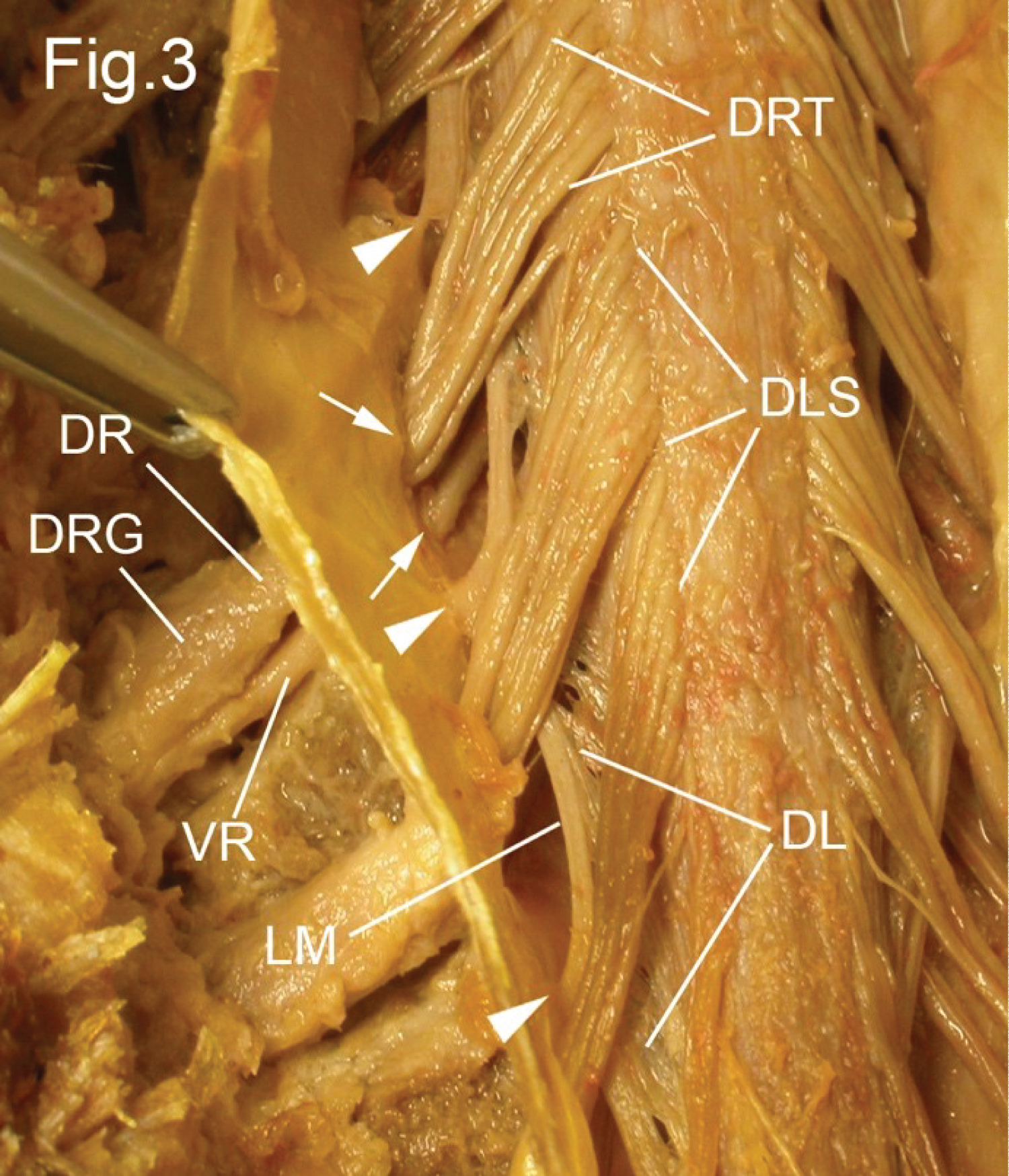 Figure 3: Dissection of the dorsal aspect of the spinal cord. The dura and arachnoid maters were cut longitudinally and reflected, thus opening the subarachnoid compartment, which in the living contains the cerebrospinal fluid. The spinal cord and spinal nerves are seen through the delicate pia mater which intimately invests the cord and nerves. The dorsal roots (DR) split vertically into dorsal rootlets (DRT) which enter the spinal cord along the dorsolateral sulcus (DLS). The dorsal root shows a swelling, the dorsal root ganglion (DRG). The dorsal root (DR) and ventral root (VR) pierce the arachnoid and dura separately (arrows) and acquire a meningeal sleeve from each. At the lateral aspect of the spinal cord the pia mater is pulled laterally to form a double membrane, the denticulate ligament (DL), the free lateral margin (LM) of which has teeth-like projections (arrowheads) which pierce the arachnoid mater and fuse with the dura mater to support the spinal cord.