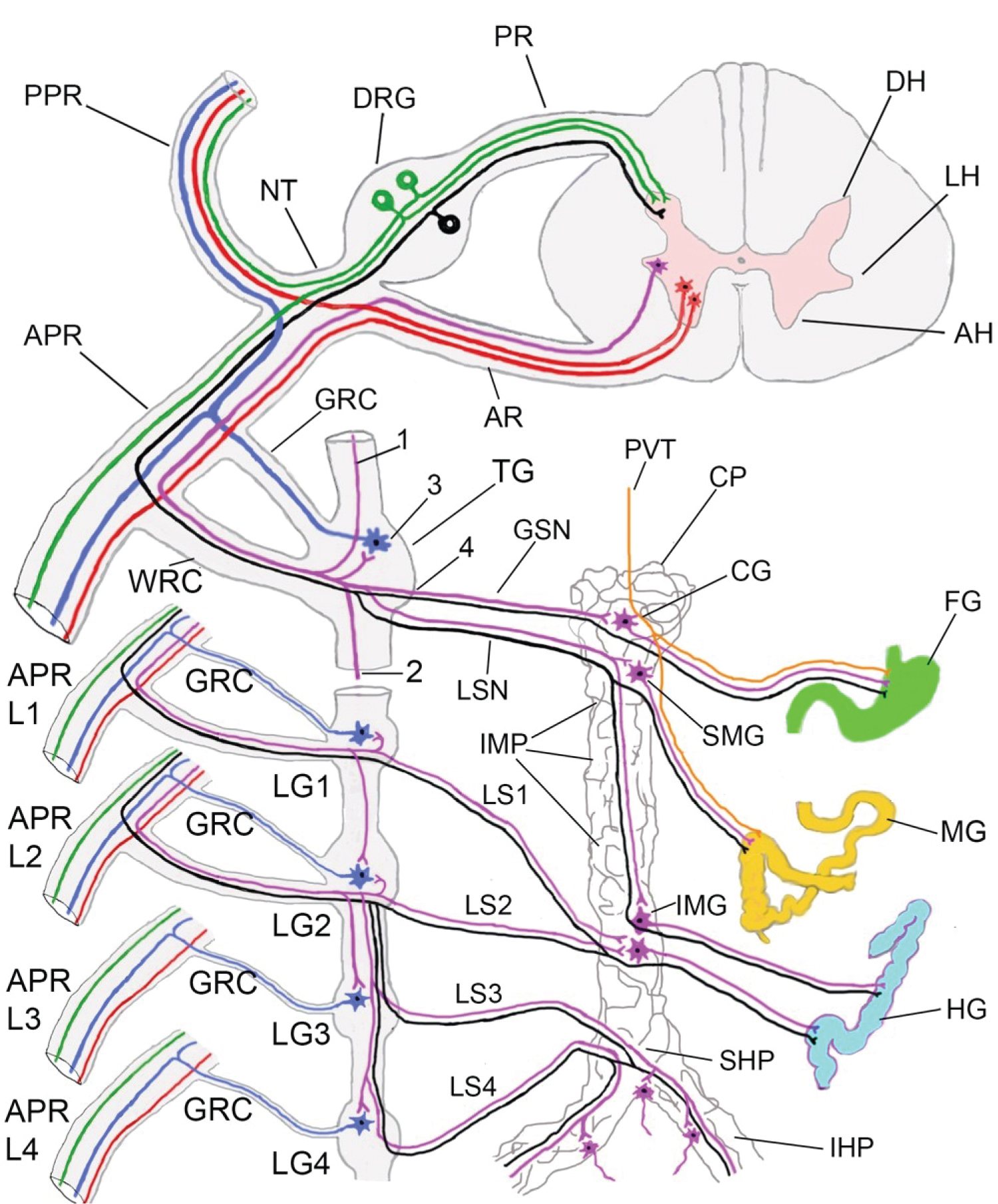 Figure 4: Diagram of a transverse section of a thoracic spinal cord segment, with a spinal nerve attached via a posterior root (PR) and an anterior root (AR). To simplify the diagram one thoracic sympathetic ganglion is depicted (TG) to represent the sympathetic ganglia T5 to T11. The four lumbar sympathetic ganglia (LG1 to LG4) are depicted.